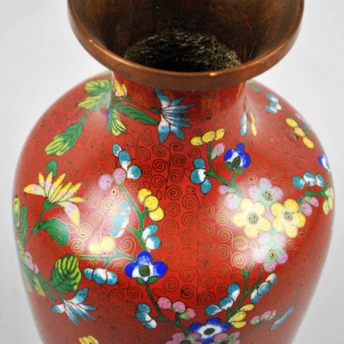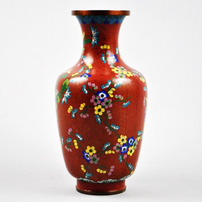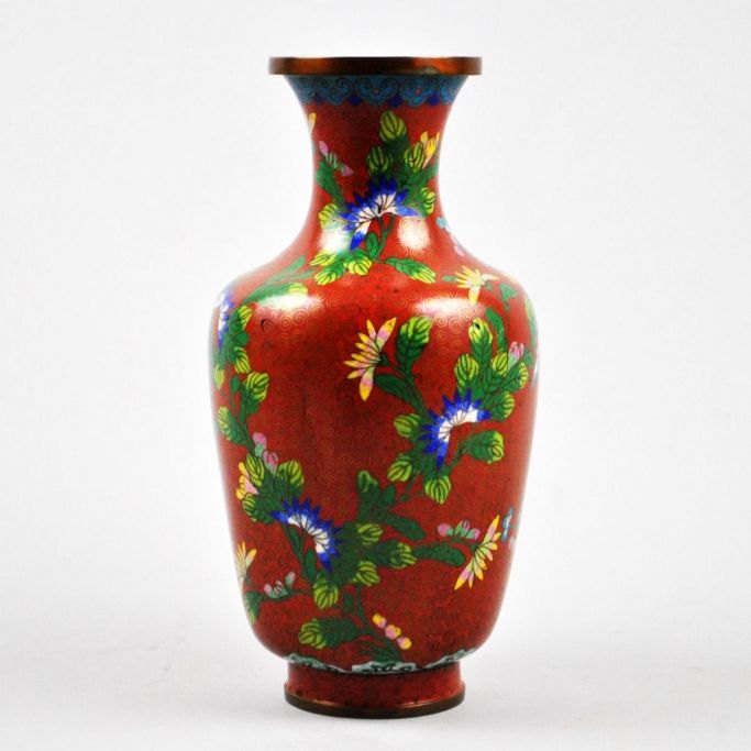 Cloissonne vase, Kina, 20. årh.  I emaljeteknik på kobber, dekoreret med blomster.  H: 23 cm.