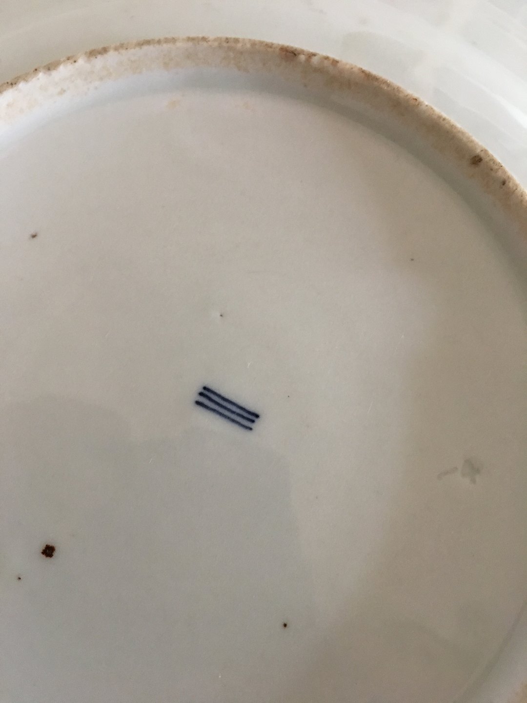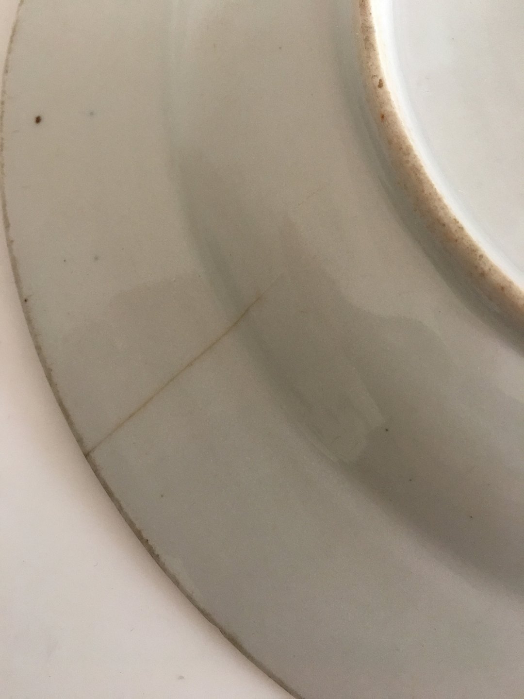 Antik Royal Copenhagen Tallerken med Blomsterdekoration 1790-1810. Porcelænet er en del slidt. Ligesom blomstermotivet er en del falmet. Har et hårstrejf på kanten af tallerknen og et skår underneden på støttedelen. Måler 24.5 cm