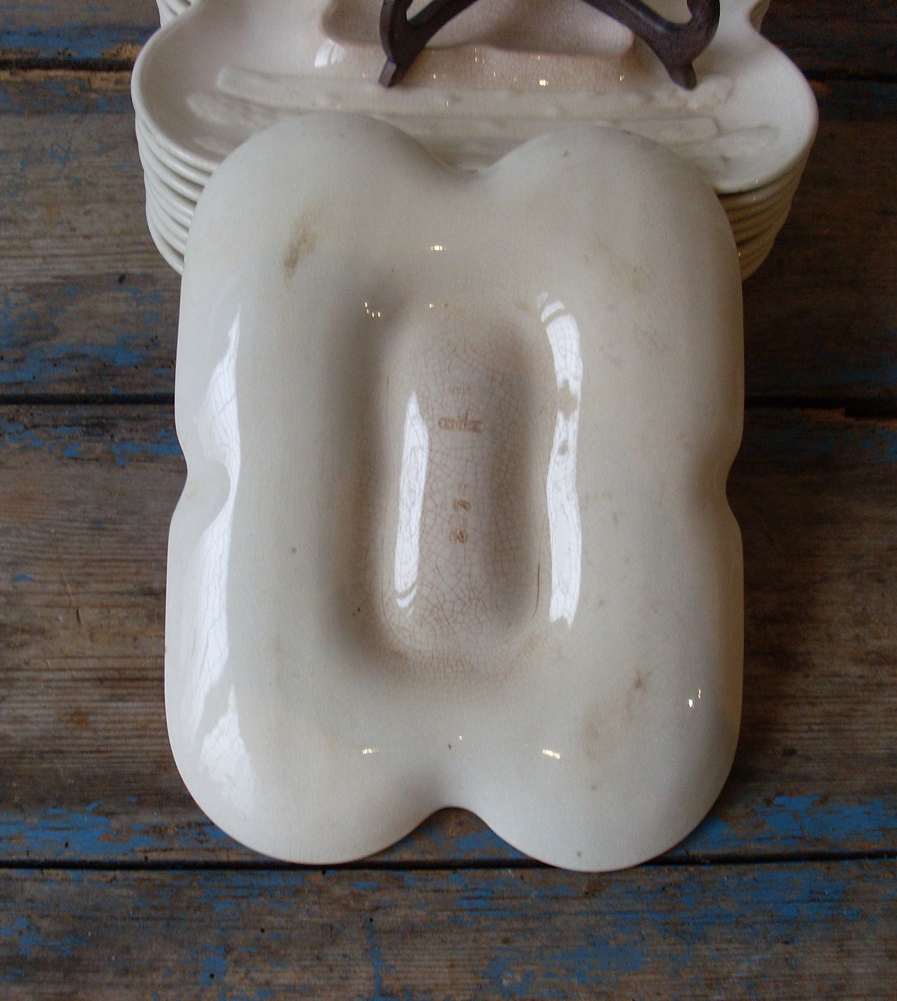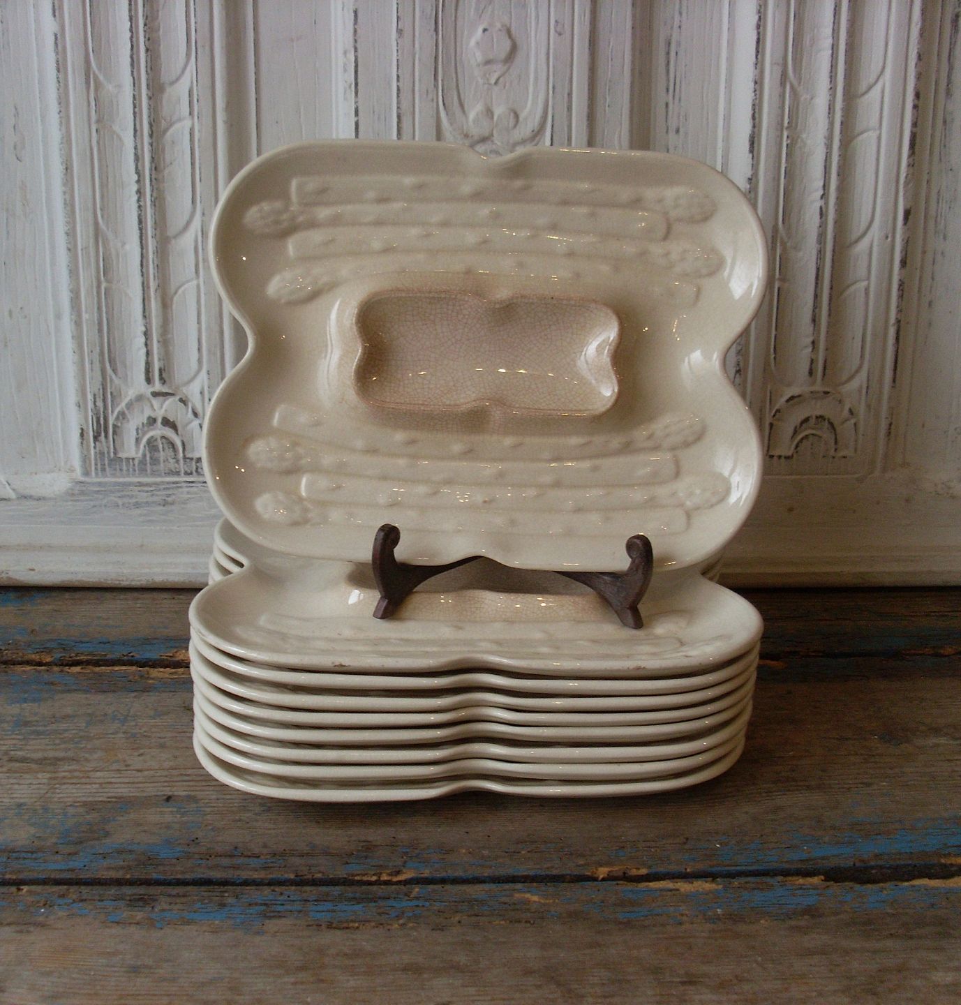 Asparges tallerkener i cremefarvet fajance, med fin patina.