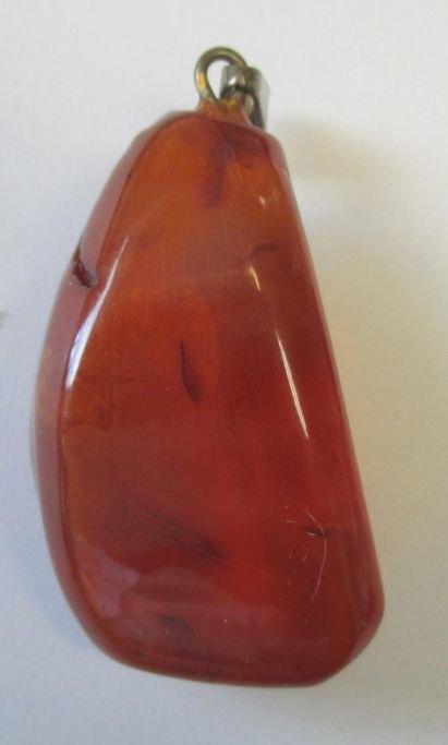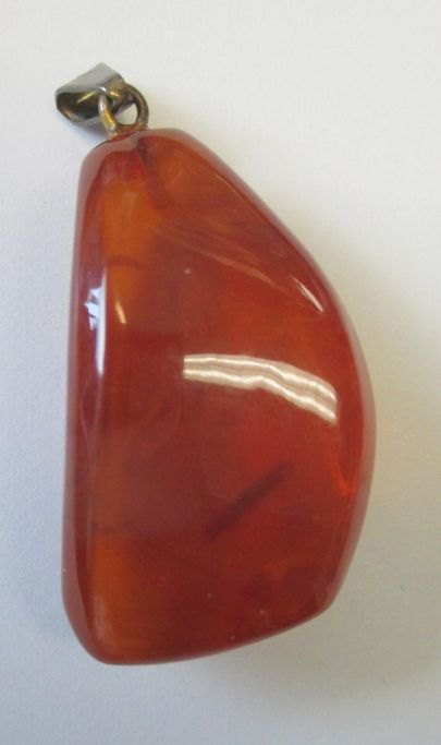 Poleret rav stykke, Danmark. Med frø. Med sølv øsken. Længde.: 4,5 cm.