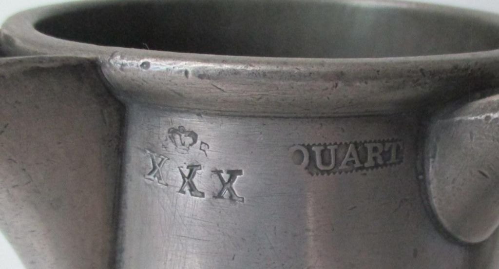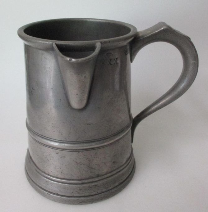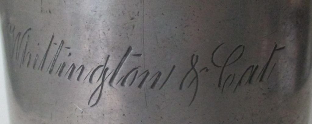 Tin kande, quart,  19. årh. England. Med hank og tud. Stemplet på kant og i bund. På siden indgravering: Whittington & Cat. Højde.: 15 cm.