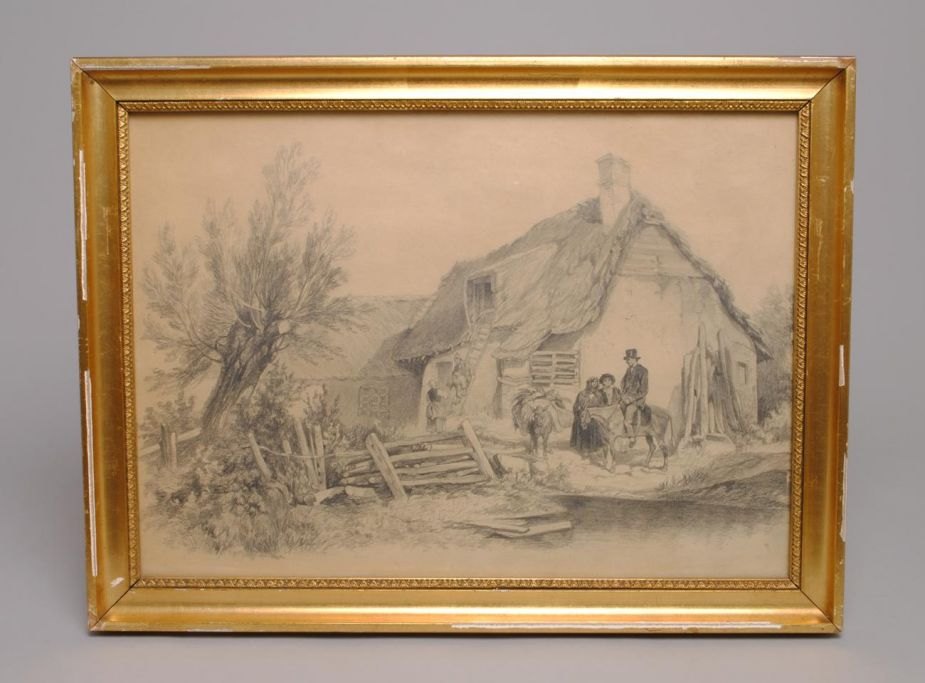 Møller, Jens Peter (1783 - 1854) Danmark: Personer ved bondegård. Usigneret. Bly på papir. 24 x 33,5 cm.
