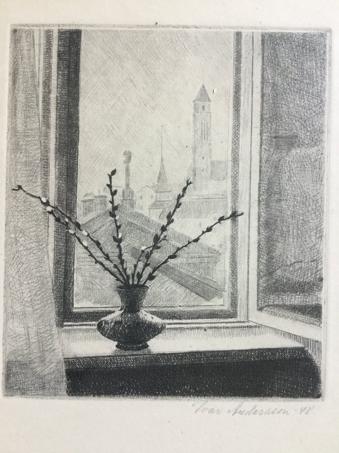 Radering af Ivar Andersson - vindueskarm med vase 1948.