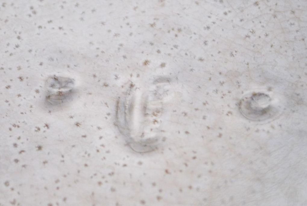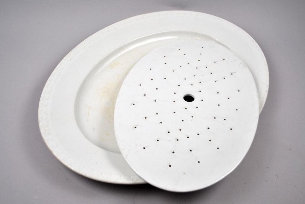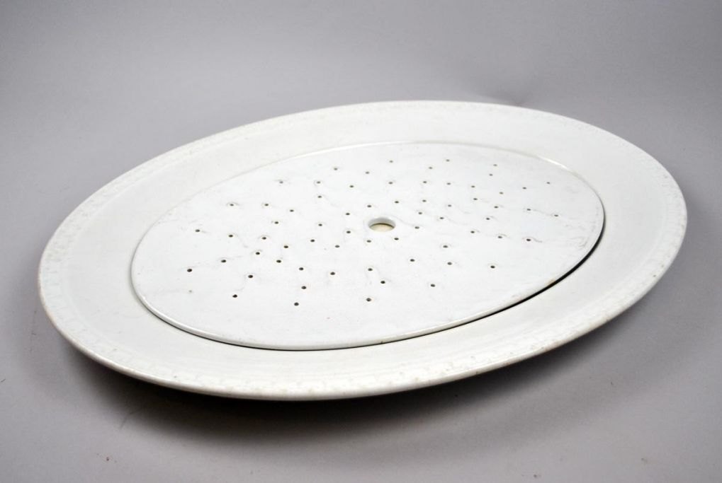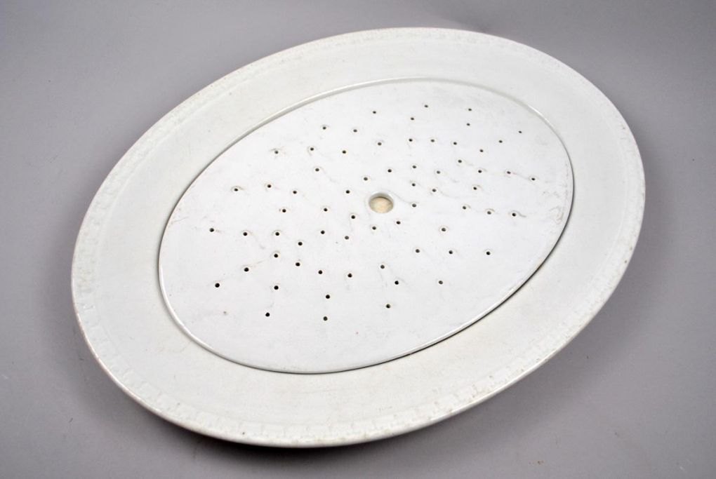Antique Aluminia faience fish dish. 19th century Copenhagen, Denmark. Light faience with lace decoration. Stamped. L: 55 cm. B: 41 cm.