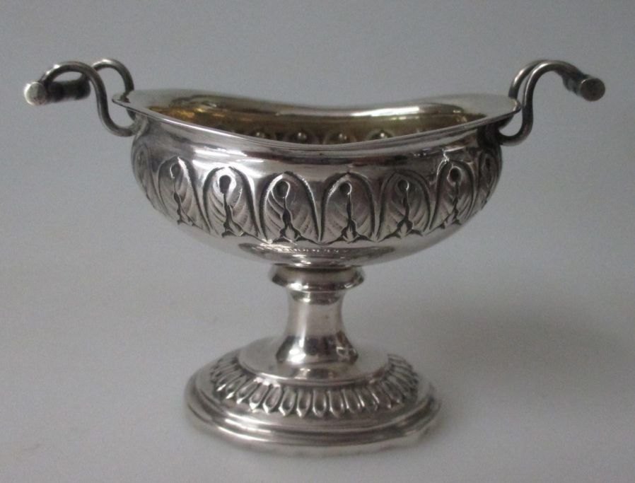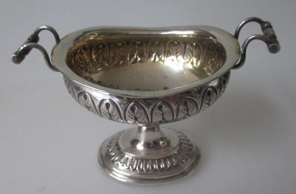 Silver salt, 1832, silversmith Heinrich Otto (1800 - 1868), Copenhagen, Denmark. Inside gilded. Empire. With two handles. Decoration on corpus and foot with akantus leaves. Height: 8 cm. Length: 10.5 cm. Stamped on the corpus and foot.