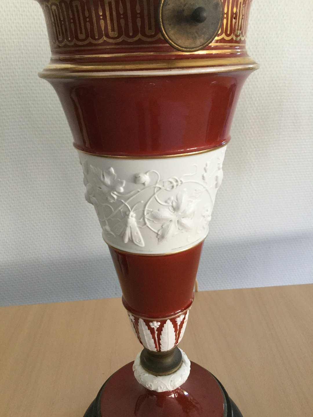 Sort marmor sokkel, terrakotta farvet porcelæn med friser af bisquit porcelæn.
