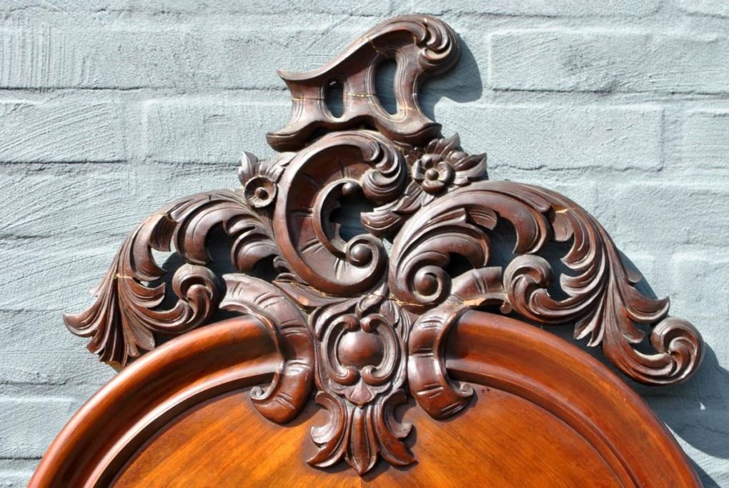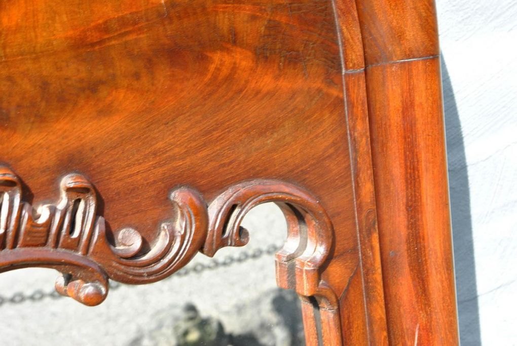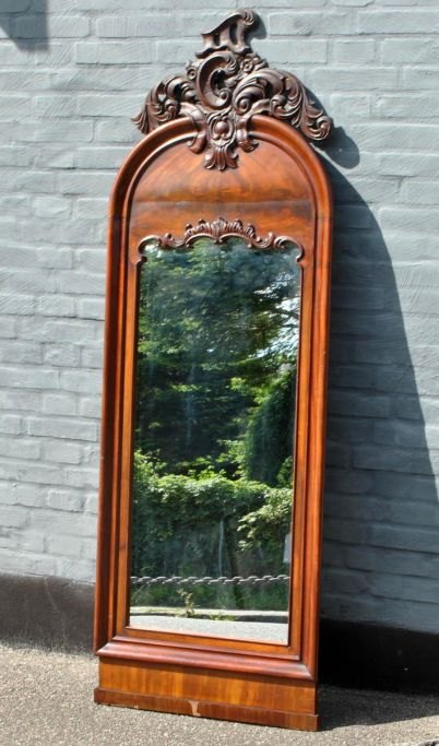 Dansk nyrokokko spejl. 19. årh. Poleret mahogni. Med top. H: 185, B: 64 cm.