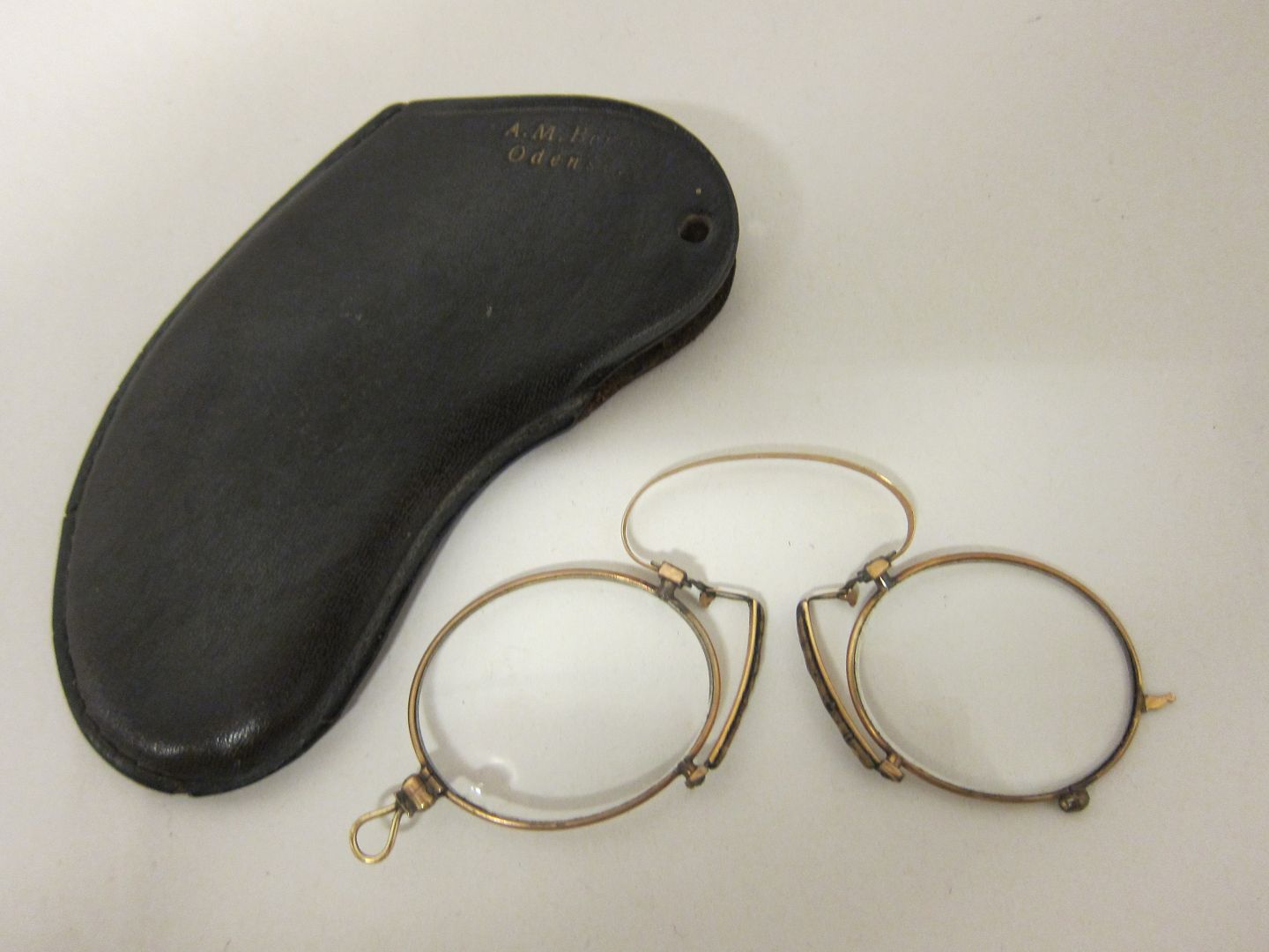 Gamle briller, såkaldte "kneifer" til at sætte på næsen, inkl. etui