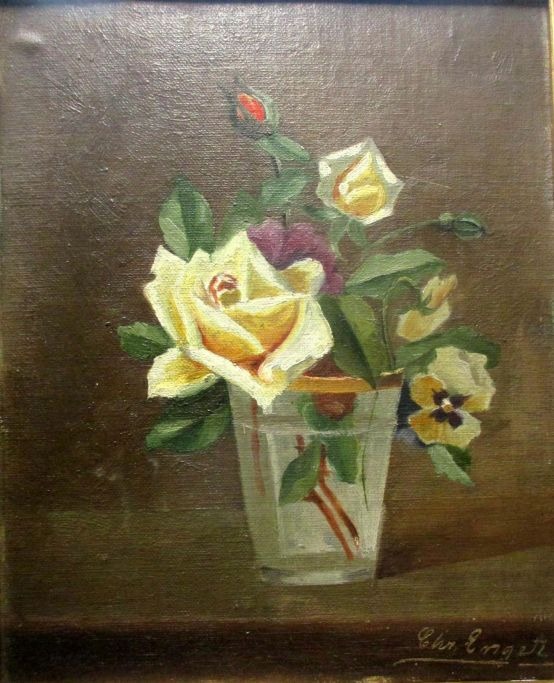 Engert, Christian (20. årh.) Danmark: Blomster i et glas. Olie på lærred/pap. Signeret: Chr. Engert. 25 x 20,5 cm.