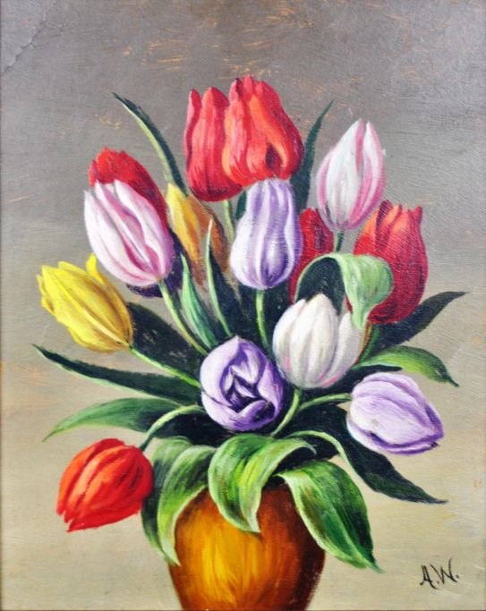 Westphal, Anna, (1868 - 1950). Tulipaner. Olie på plade. Signeret: Monogram. 30 x 24 cm.