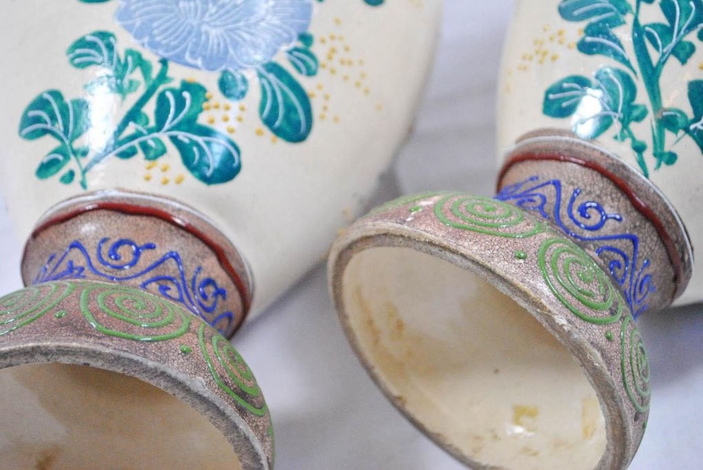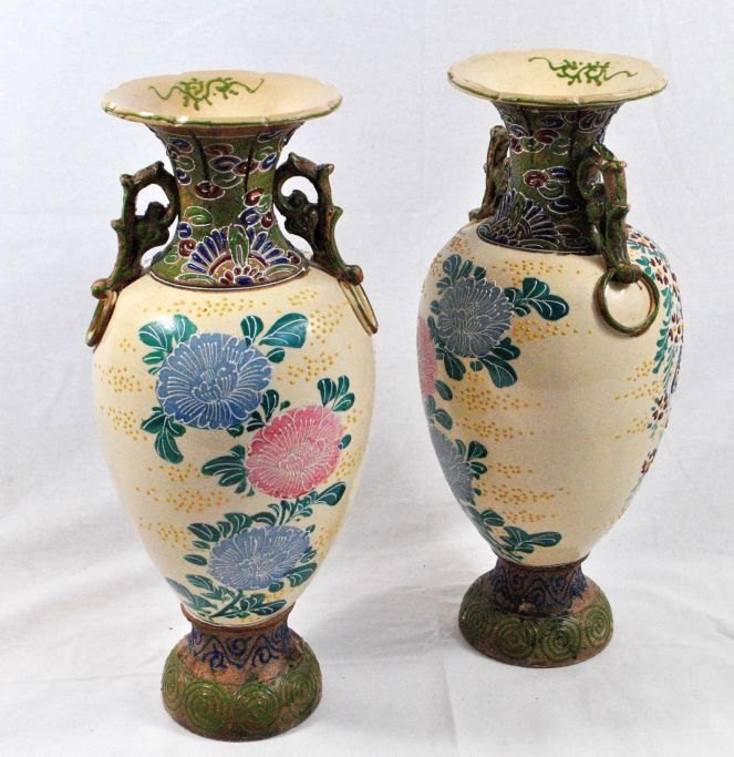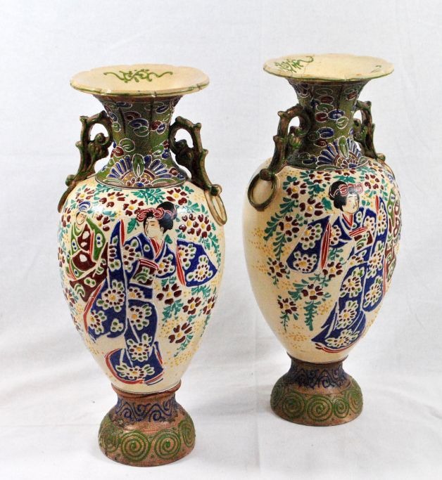 Par japanske Satsuma vaser. 19. årh. Fajance. Polykrom dekoration i form af blomster og personer. Signeret. H. 37,5 cm.
