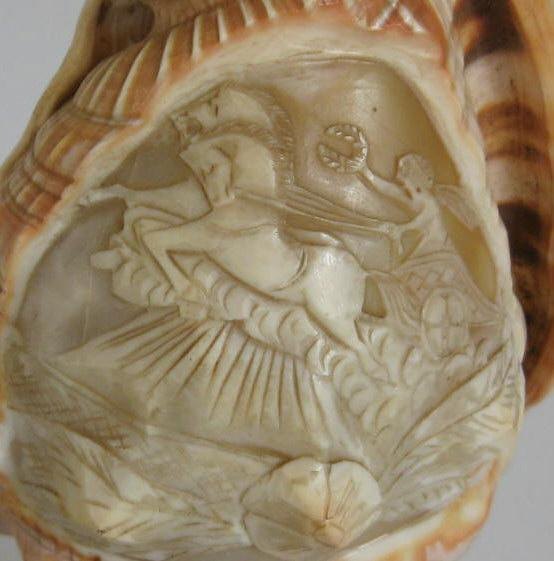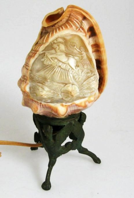Camé lampe, Italien, o. 1900, på grønmalet støbejernsfod med griffer; konk med indgraveringer i form af klassisk sceneri. H.: 21 cm.