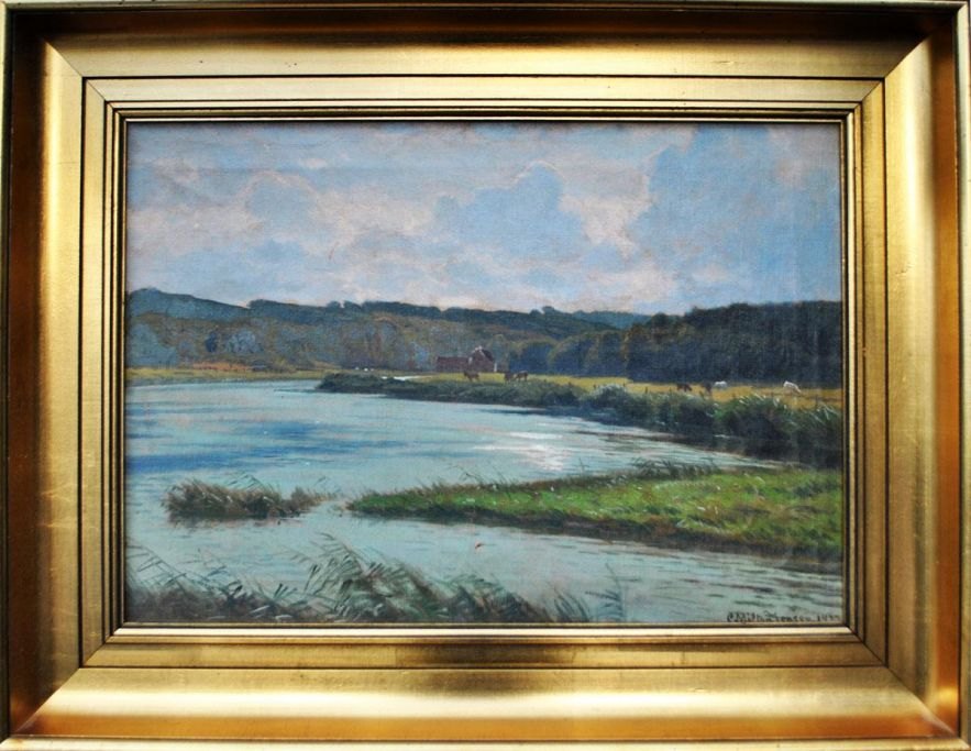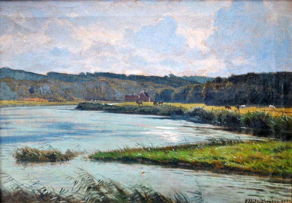 Milton Jensen, Carl (1855 - 1928) Danmark. Gudenåen ved Løjstrup. Olie på lærred. Signeret.: C. Milton Jensen 1922. 40 x 57 cm.