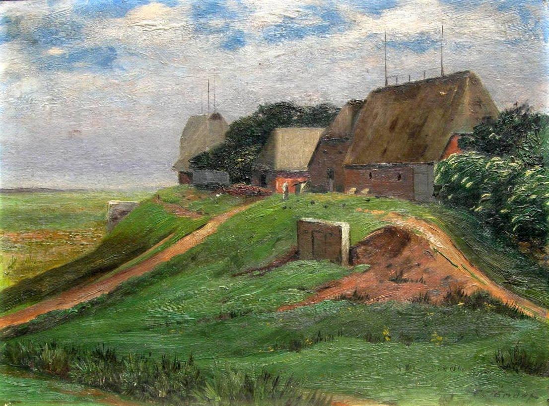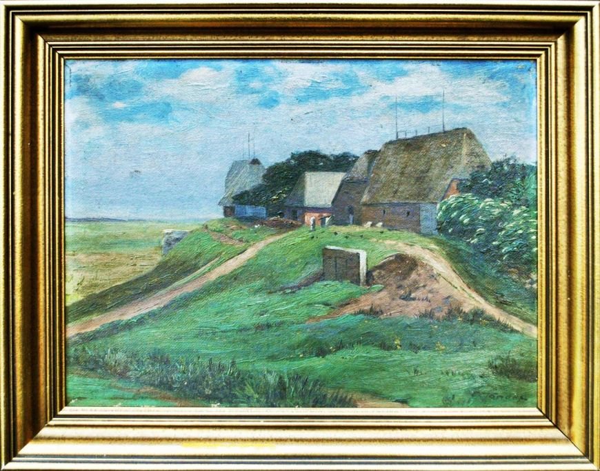 Tønder, Carl (19. - 20. årh.) Danmark: En gård i marsken. Olie på lærred/malerpap. 29 x 37 cm. Med nyere forgyldt ramme. Jeg takker venligst Jens Jørgen Kærgaard for hjælp til identifikation.