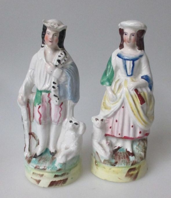 Par Staffordshire fajance figurer af mand og kvinde med hunde, ca. 1840. England.