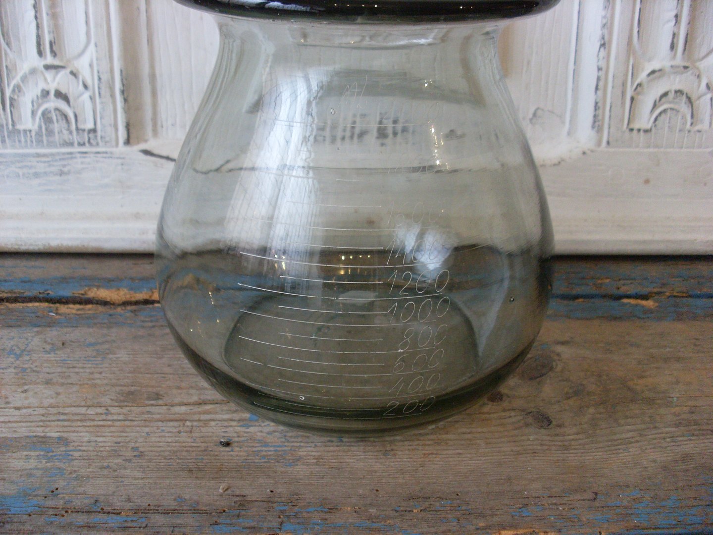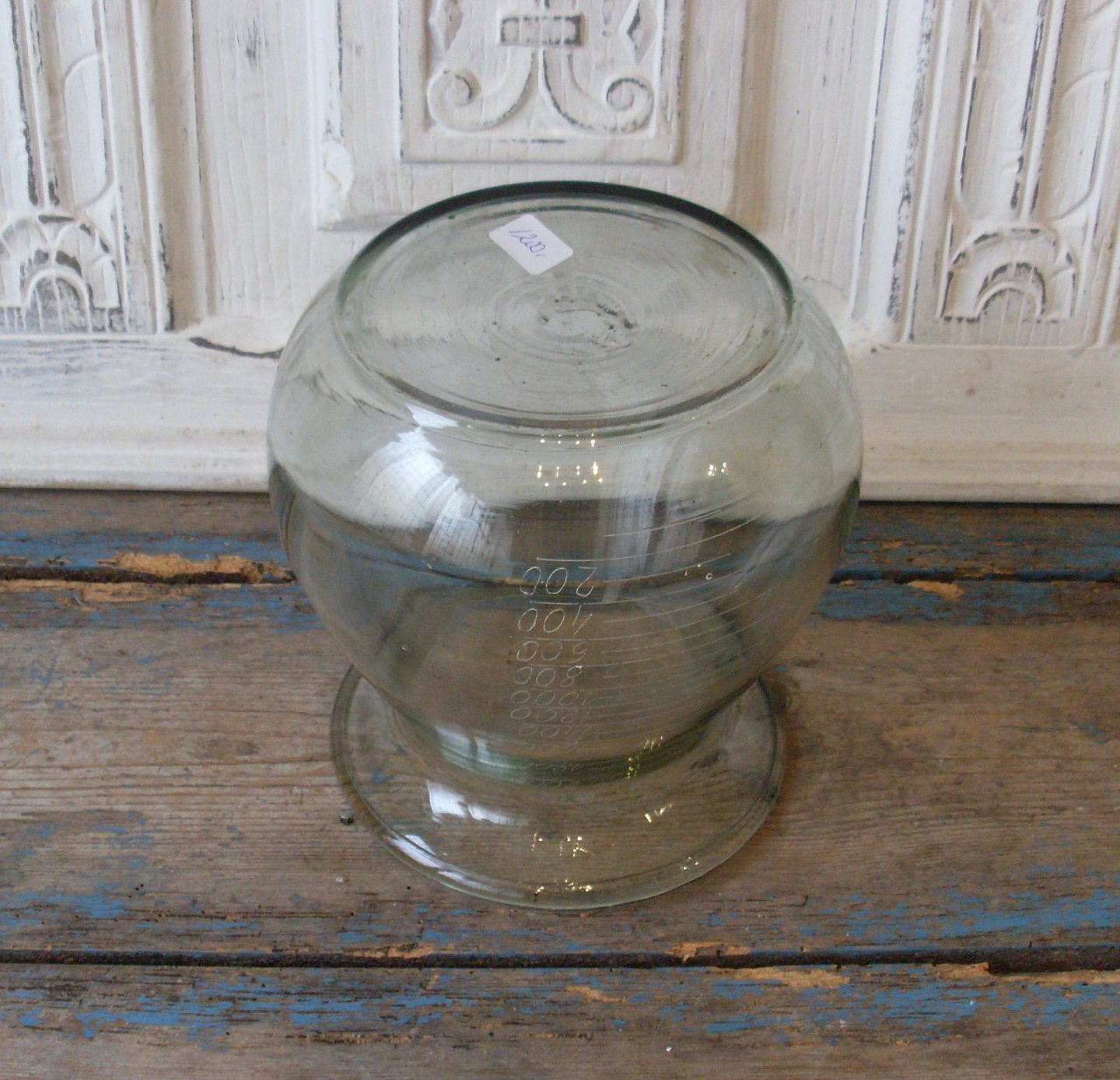 Gammelt mundblæst apoteker glas, påmalet måleenheder.