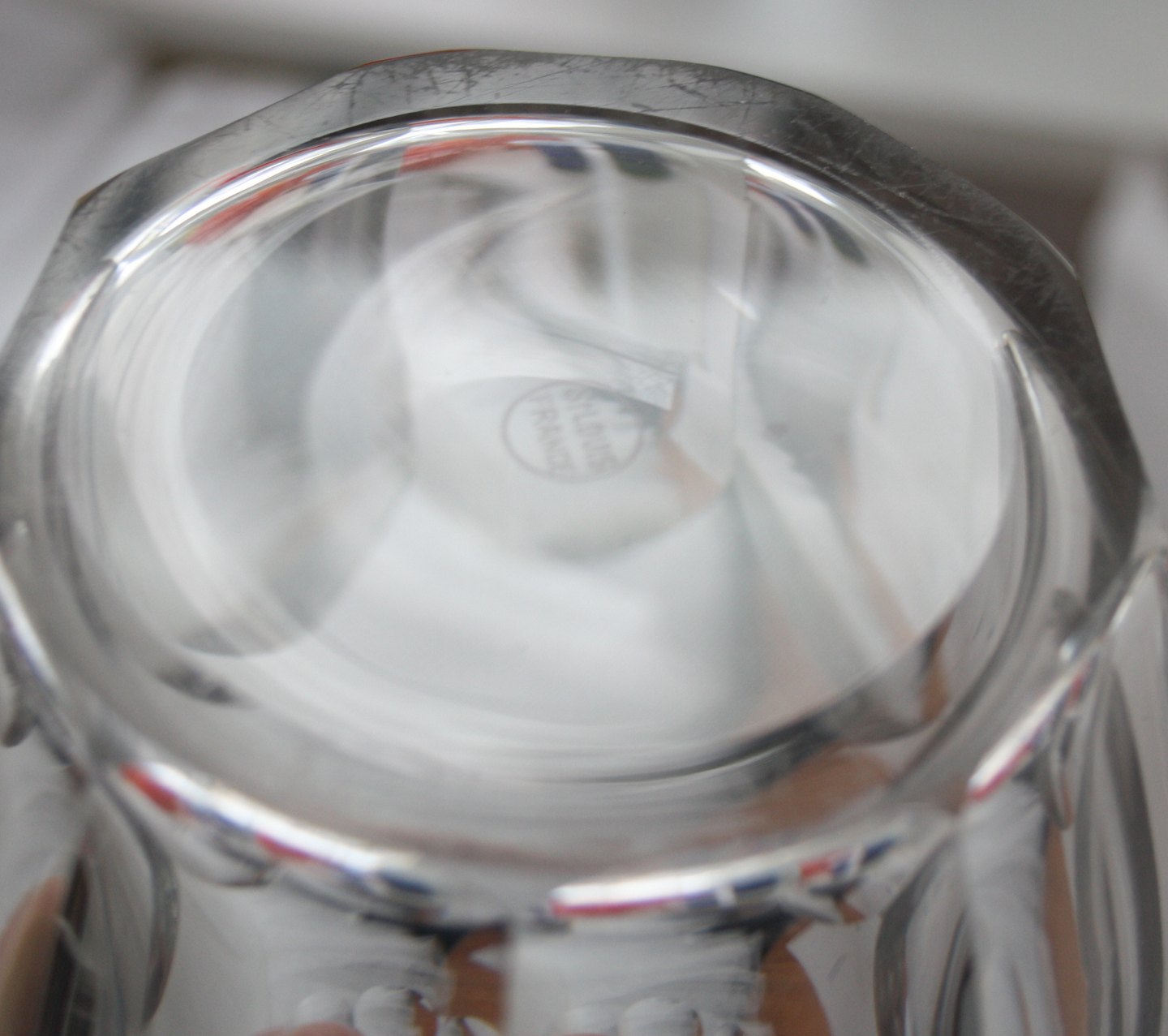 St. Louis, France Krystalkaraffel oliveslebet i bund og hals og kantet prop. Højde 25,5 cm. Perfekt stand. Pris: 675 kr.