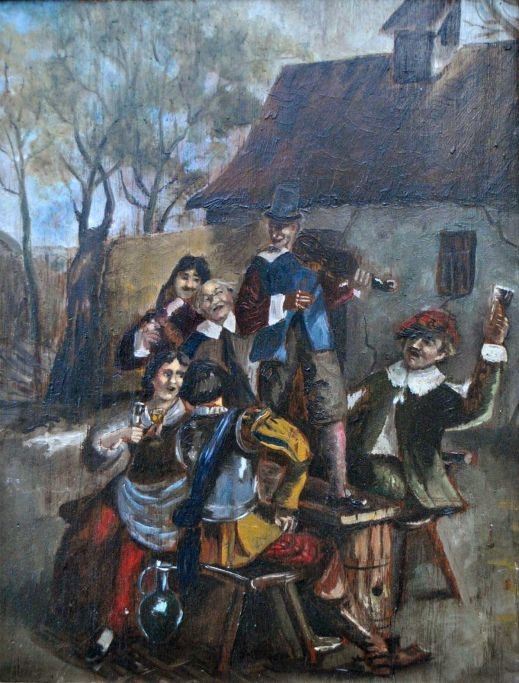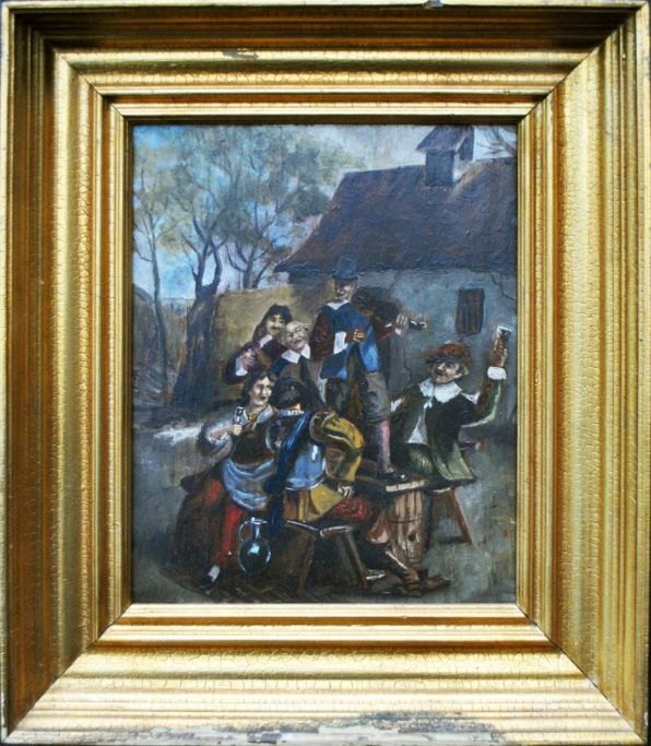 Unknown artist (19th century): Village with drinking people. Oil on oak. Unsigned. 32 x 25.5 cm. With gilded frame. On the backside indistinct name written with pencil - probably the artist's name.