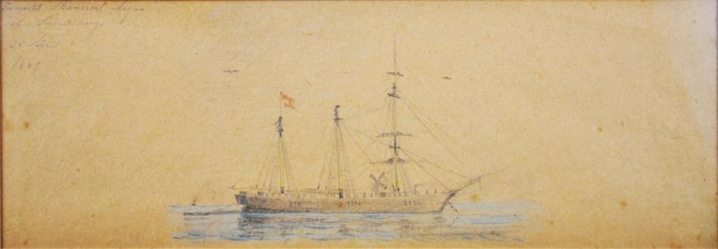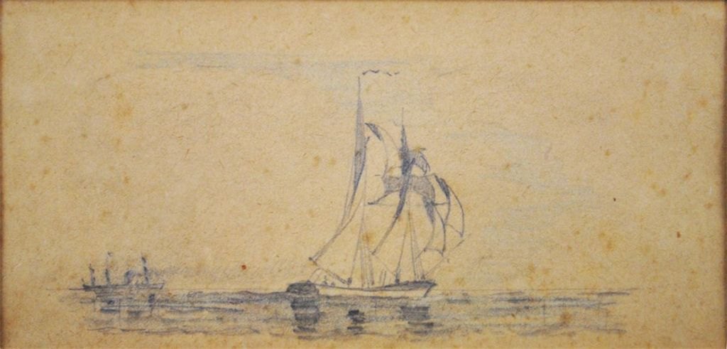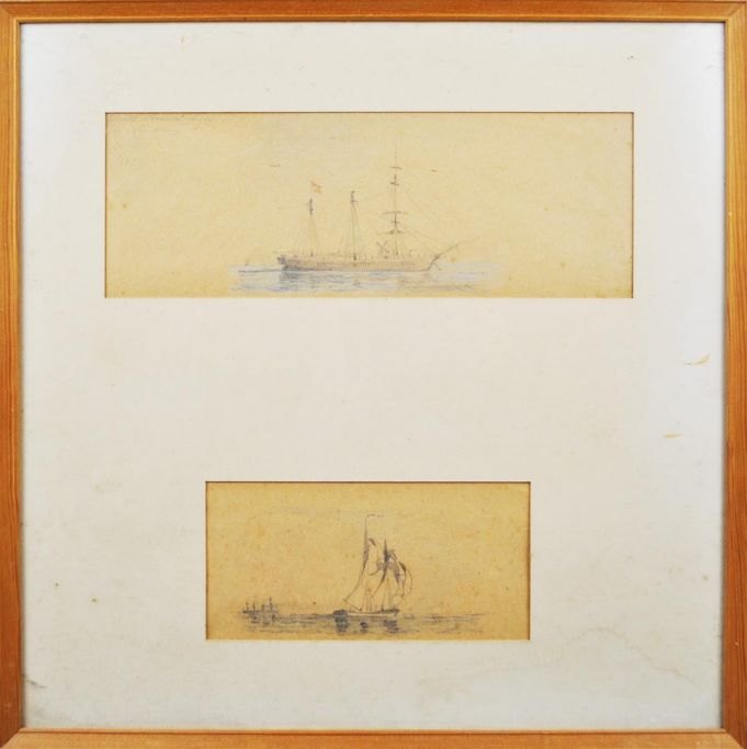 Baagøe, Carl Emil (1829 - 1902) Danmark. Skibsportræt af den tremastede skonnert Inga af Svendborg. 1889. H: 37 cm. B: 37 cm.  Uindrammet. Incl. anden tegning.