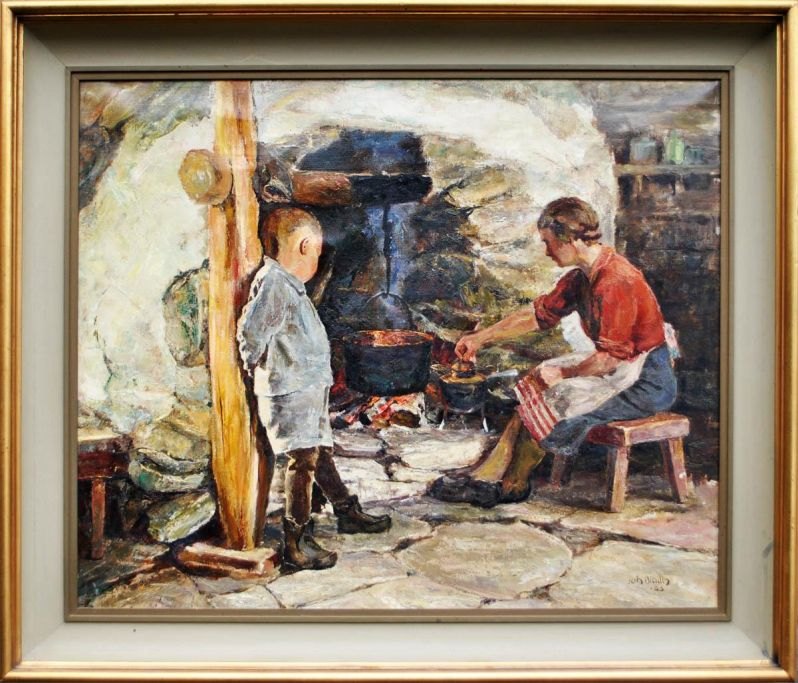 Bladh, Johan (1893 - 1976) Sverige: Moderen laver mad. Olie på lærred. Signeret: J. Bladh 43. 59 x 72 cm.