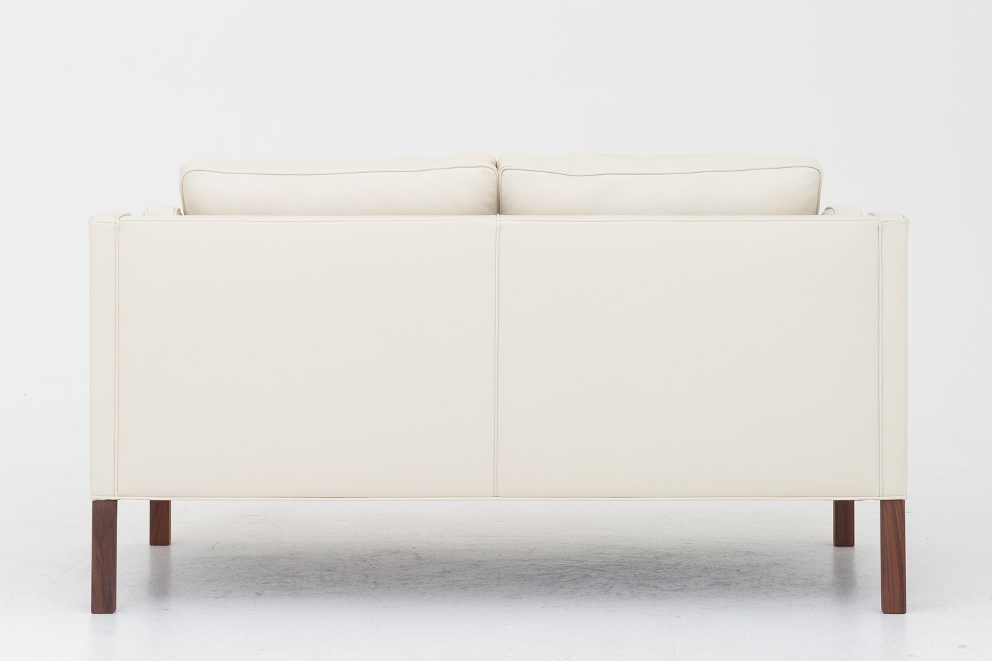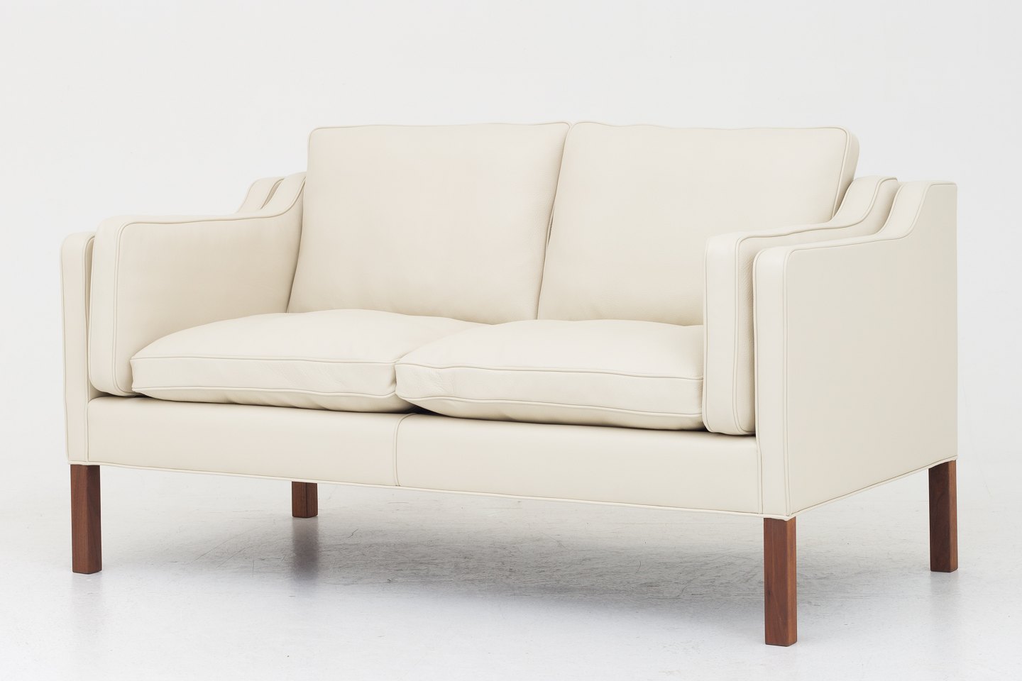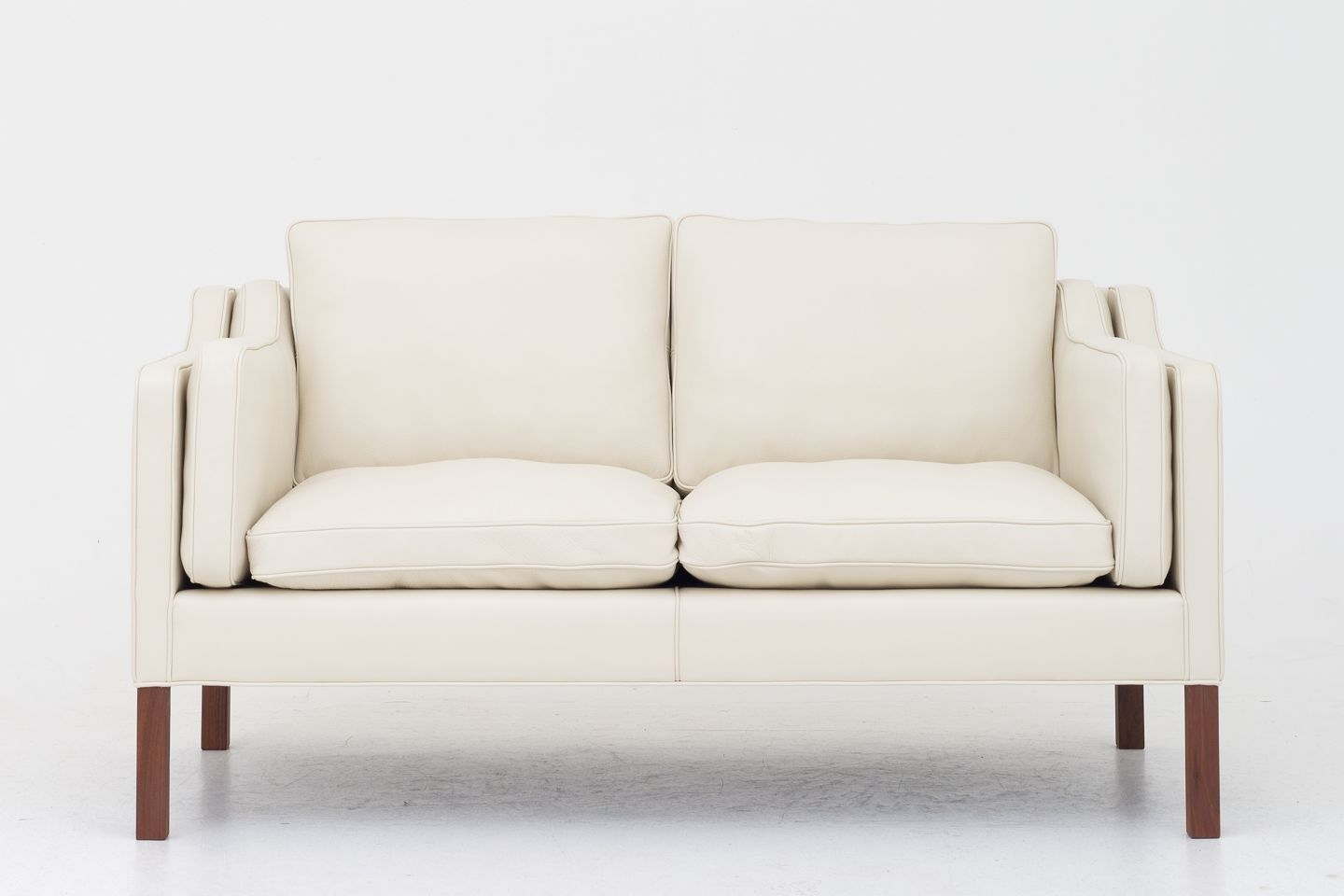 BM 2212 - Nybetrukket 2 pers. sofa i cremefarvet Paris Cream-læder med ben i mahogni. KLASSIK tilbyder polstring af sofaen med stof eller læder efter eget valg