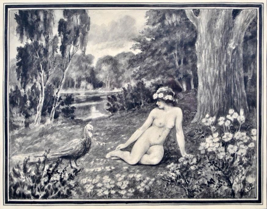 Dansk kunstner (20. årh.): Nøgen kvinde og påfugl. Tusch på papir. Signeret "OJ". 22 x 28 cm.