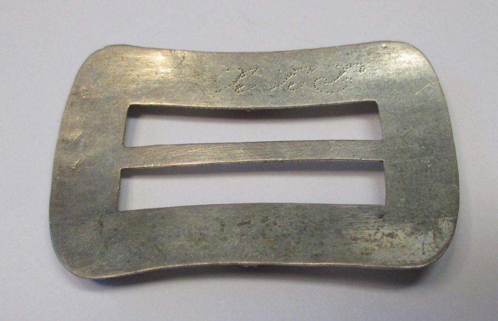 Dansk sølv bælte spænde med glas flusser, 19. årh. Med graverede dekorationer. Ustemplet. På bagsiden indgravering: P. J. K. 4,5 x 3 cm.