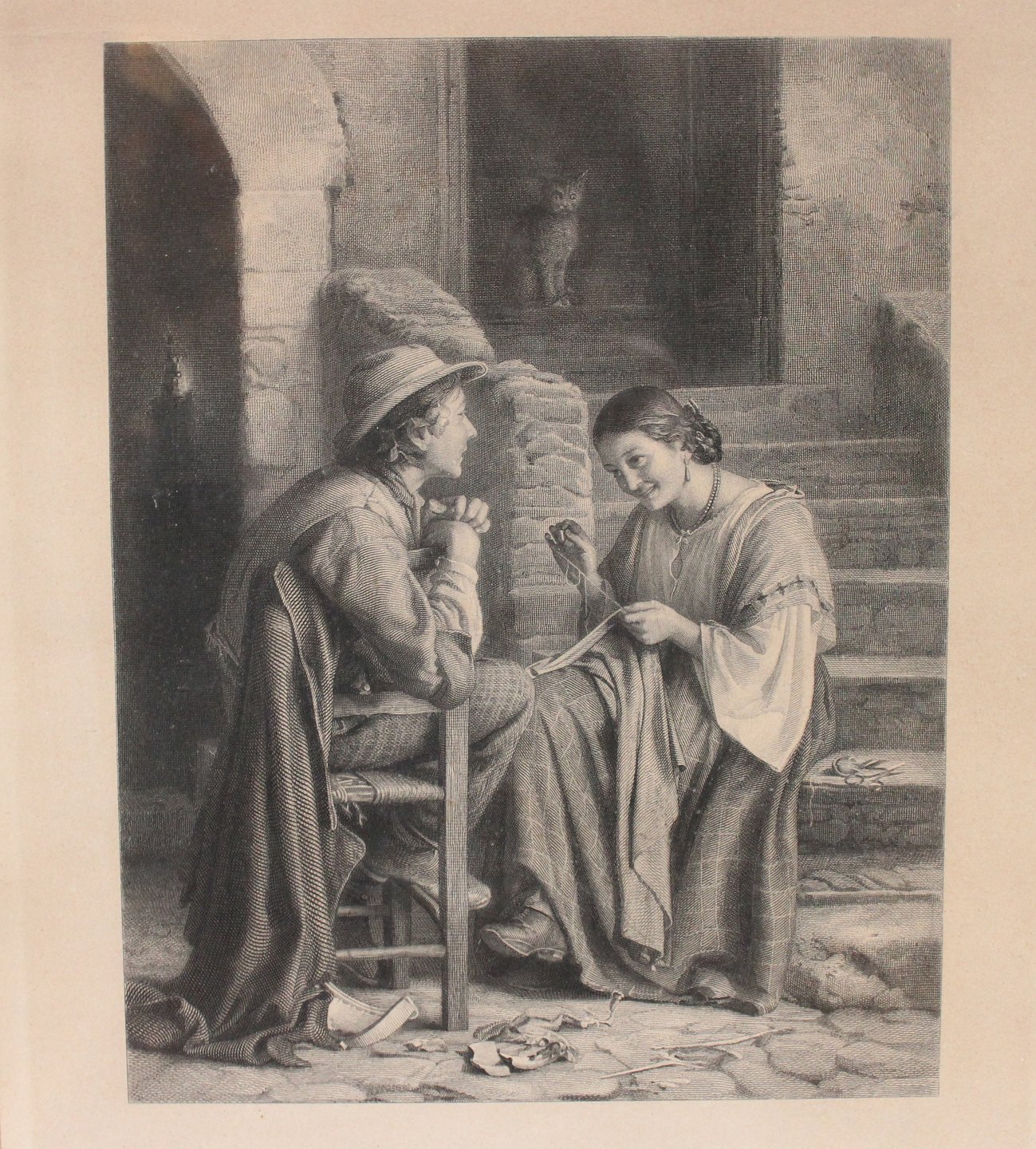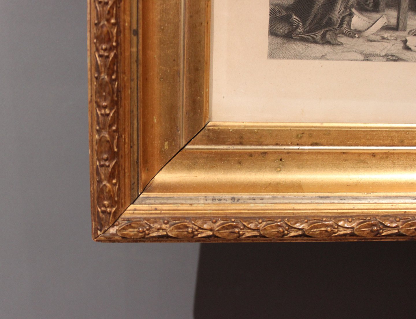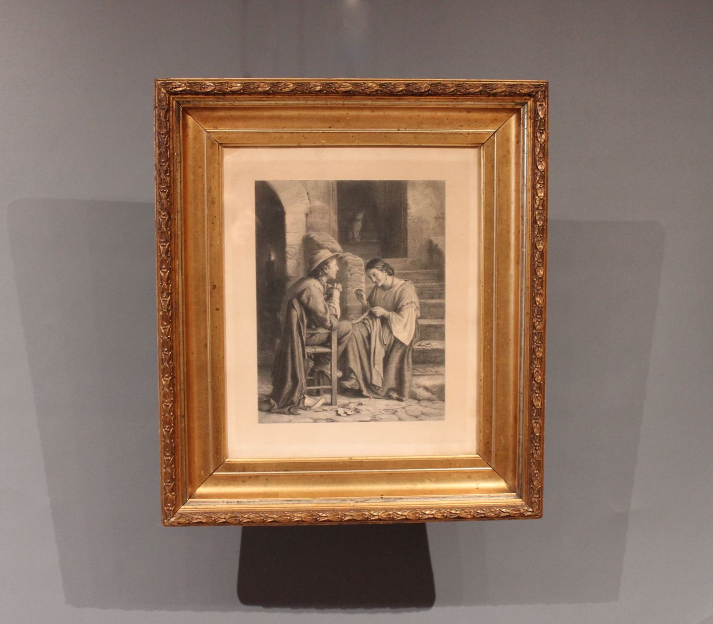 Kobberstik med motiv af mand og dame med flot gylden ramme.