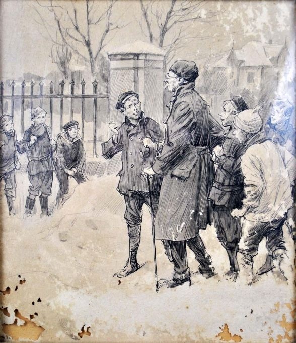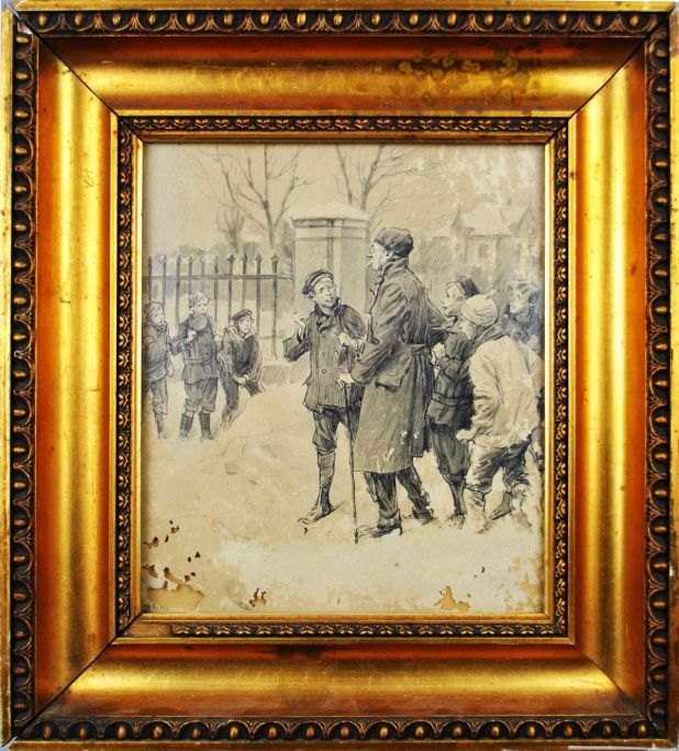 Henningsen, Erik (1855 - 1930) Danmark. Sneboldkamp. Laveret tusch. Verso betegnet. 26 x 22 cm.
