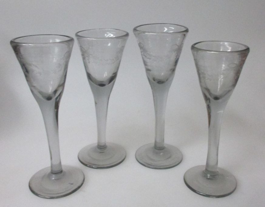 Engelske snapse glas, 19. årh. Med Louis XVI slibninger. Højde: 13,5 - 14,5 cm.