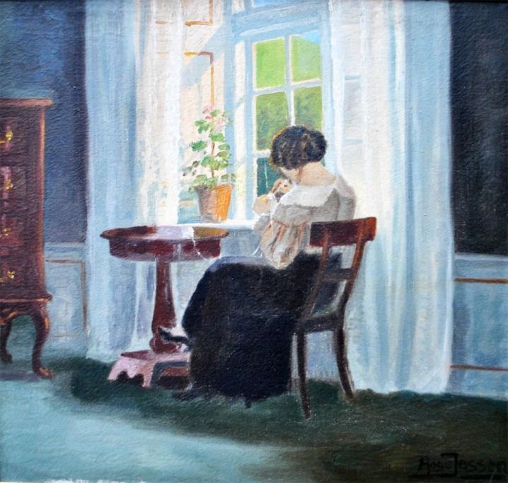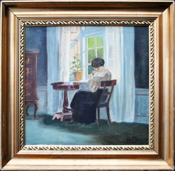 Jessen, Aage (1876 - 1961) Danmark: Interiør med ung kvinde ved vindue. Signeret Aage Jessen. Olie på lærred. 48 X 49,5 Cm.