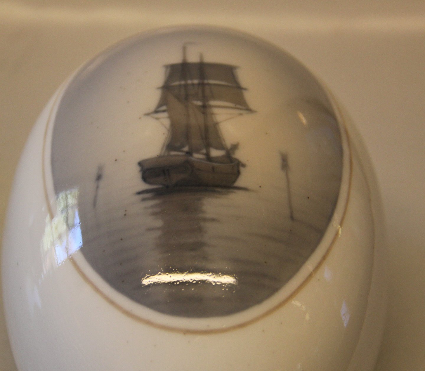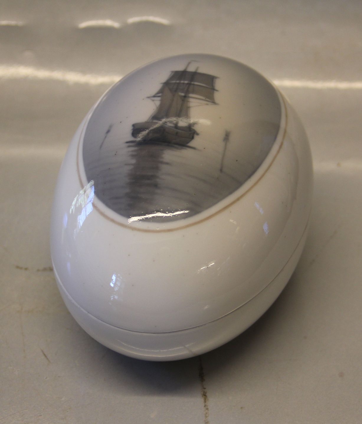 2040-1095 Kgl. Art nouveau æggeformet lågskål 16 x 11 x 11.5 cm Marine motiv fra Royal Copenhagen I hel og fin stand Sejlskib i Øresund