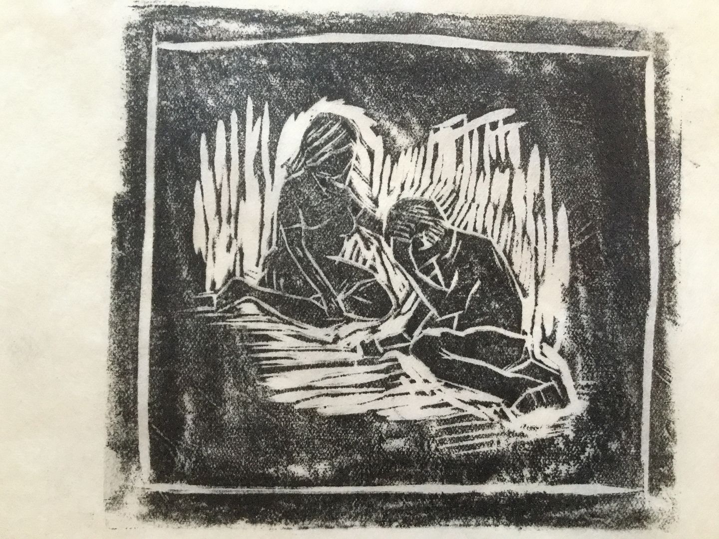 Linoleumstryk af Knud Andersen - Komposition med 2 personer 1964
