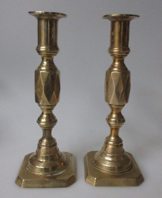 Par engelske messing stager. 19. årh. 8 kantet fod - profileret stamme med ruder motiv. Højde.: 19 cm.