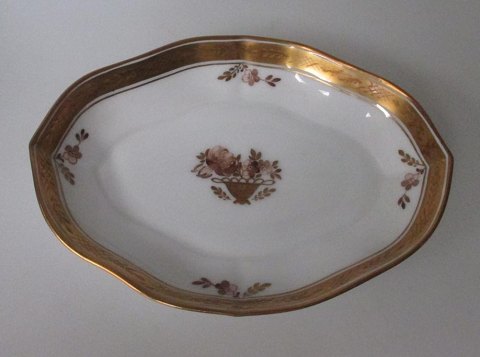Royal Copenhagen, fad, 9025, guldkurv, 20. årh. København, Danmark. Dekoreret med blomster og forgyldninger. Længde.: 17,8 cm. B.: 13,5 cm.