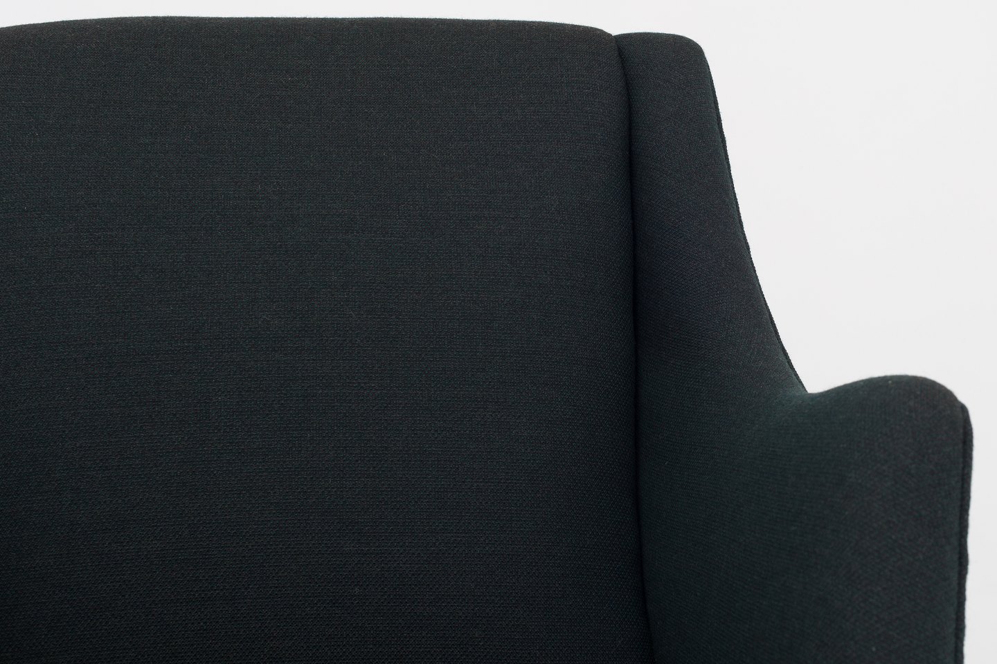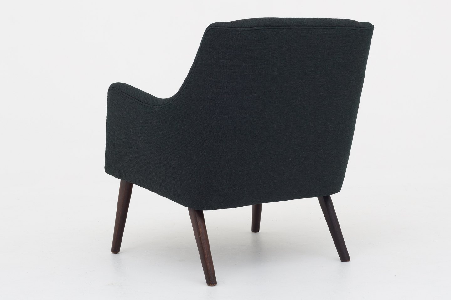 Nybetrukket lænestol i mørkegrønt uld (Fiord col. 991) med bejdsede ben
