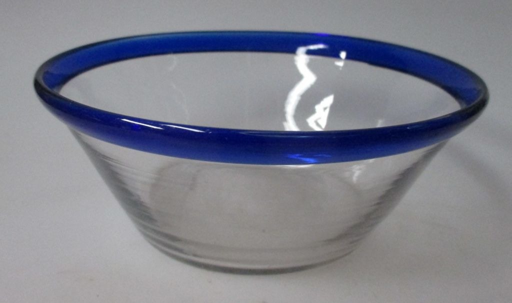 Mælke skåle. 1890 - 1910. Holmegård, Danmark. Klar glas med omlagt blå kant. H.:  6 cm. Dia.: 14,5 cm.  Pt. 9 stk. Forskellig størrelser.