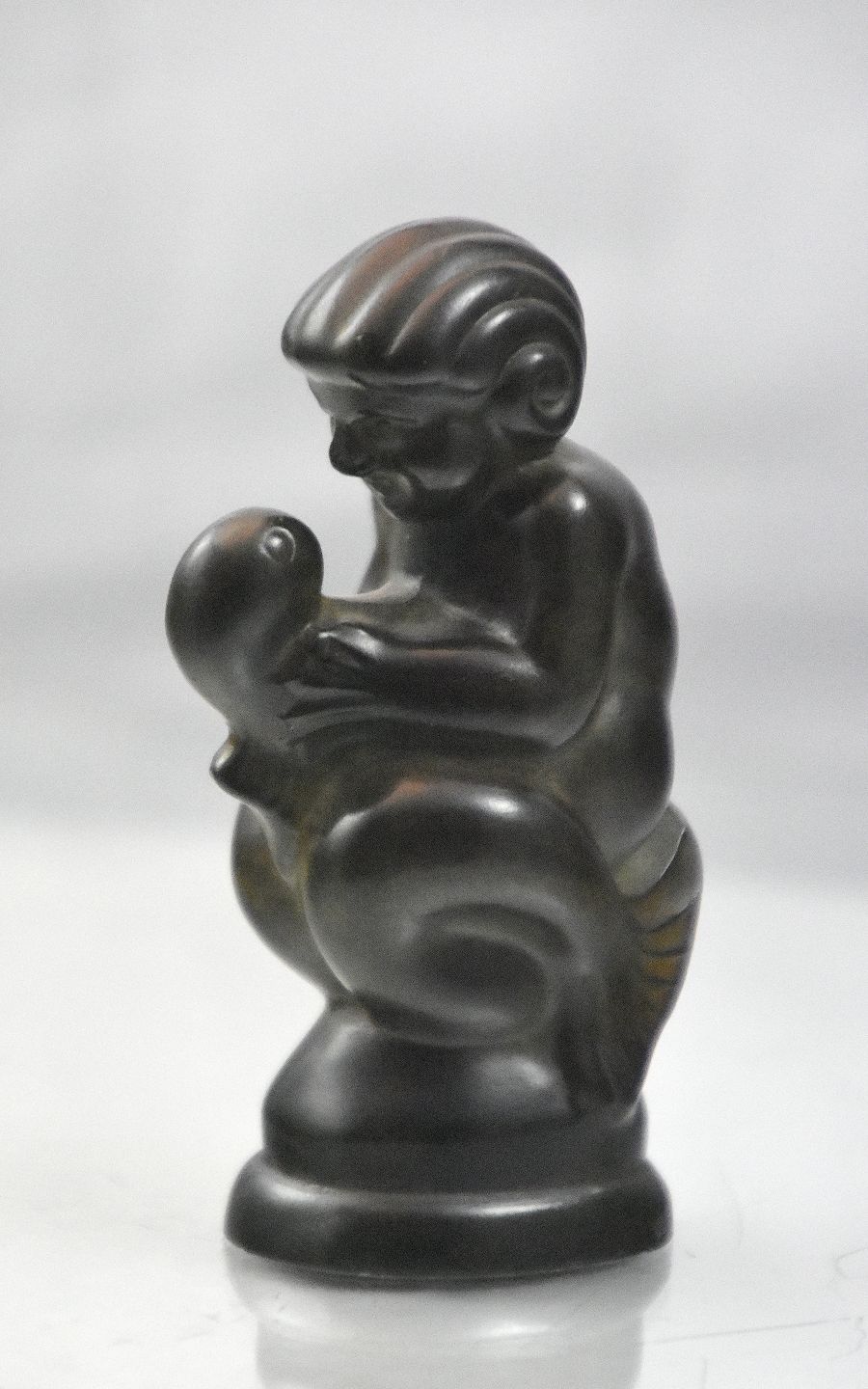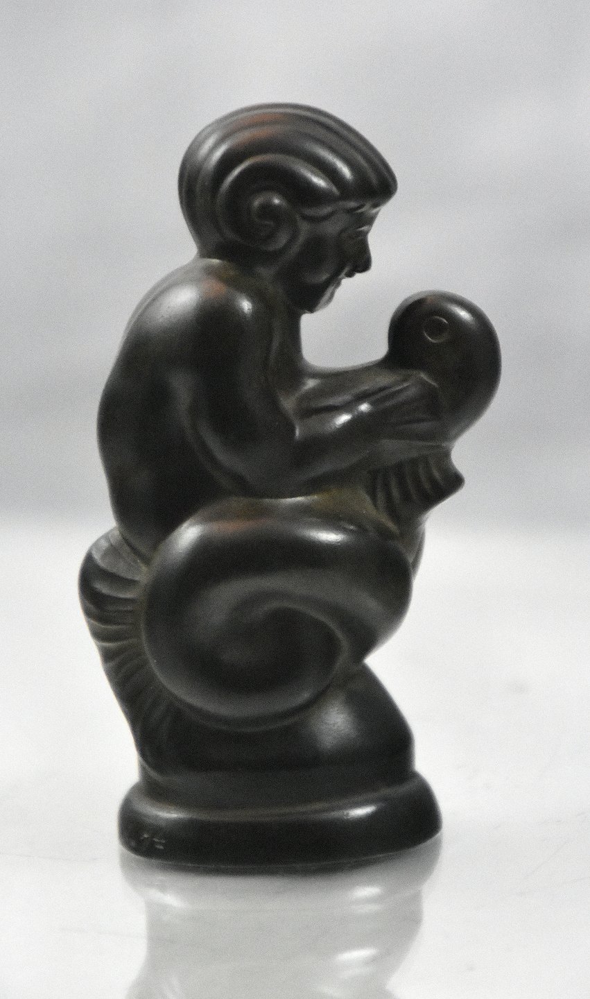 Figur i diskometal med motiv af Havmand med fisk i hænderne