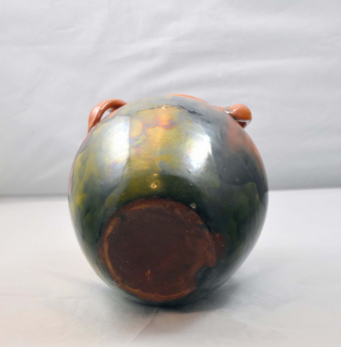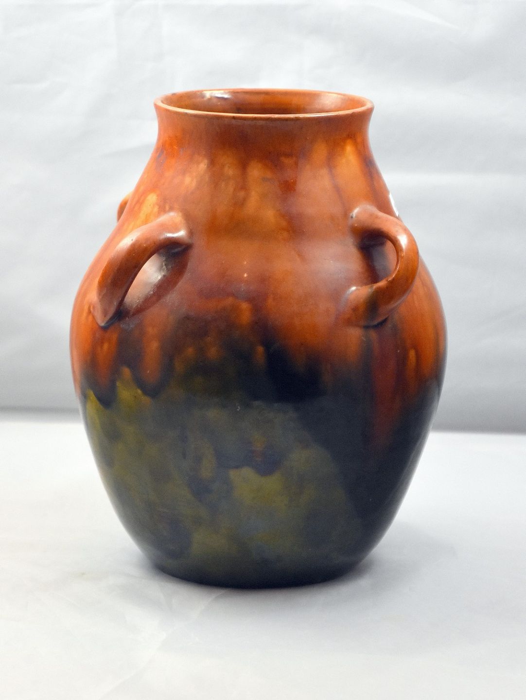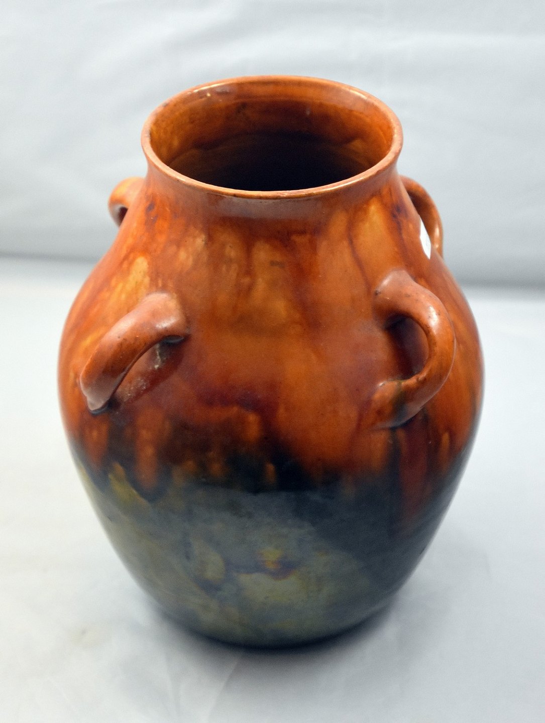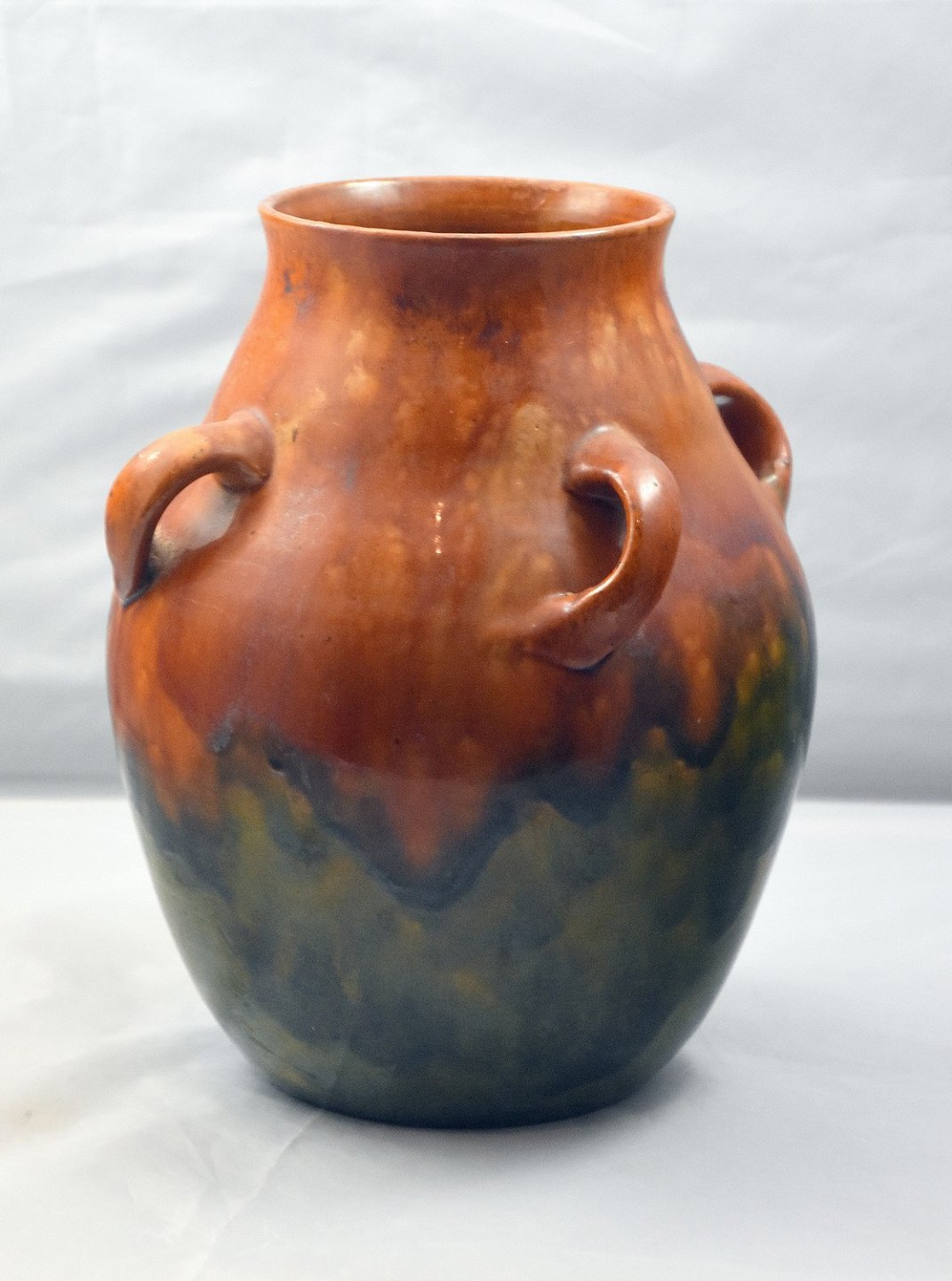 Ler vase med 4 hanke. Den har brun og grøn glassur.