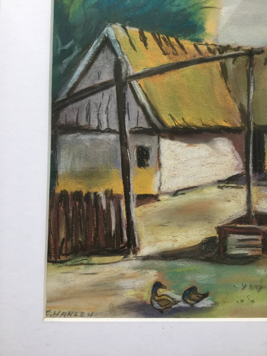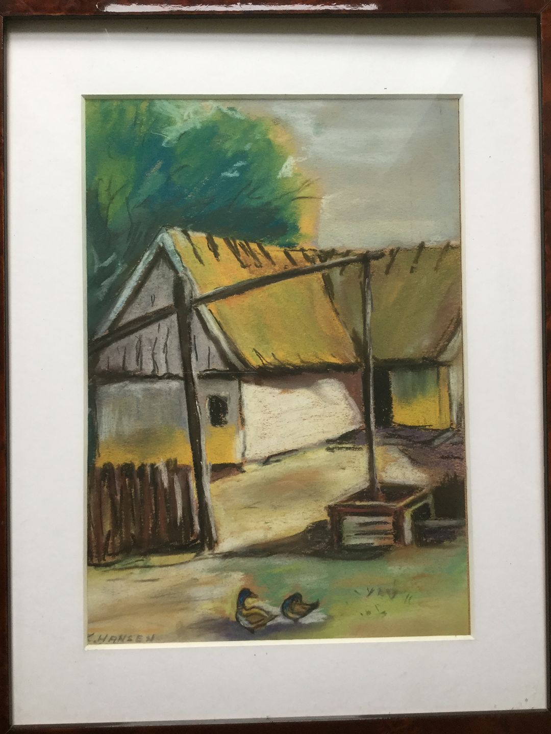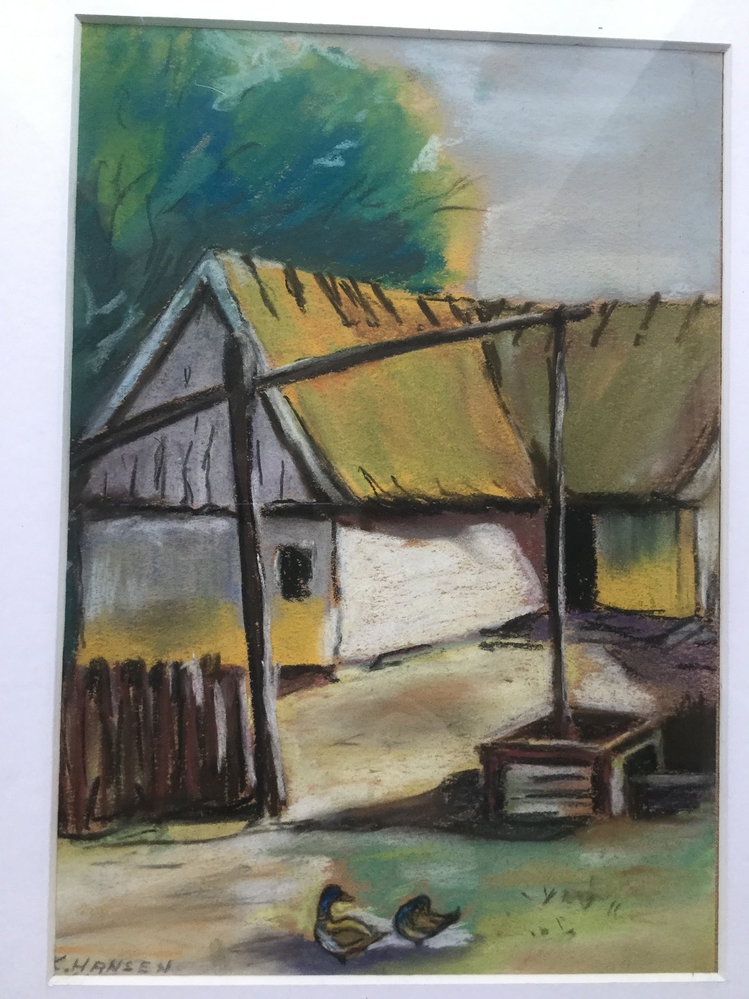 Pastel af K. Hansen 1960 - Gårdeksteriør med vandpumpe og ænder.