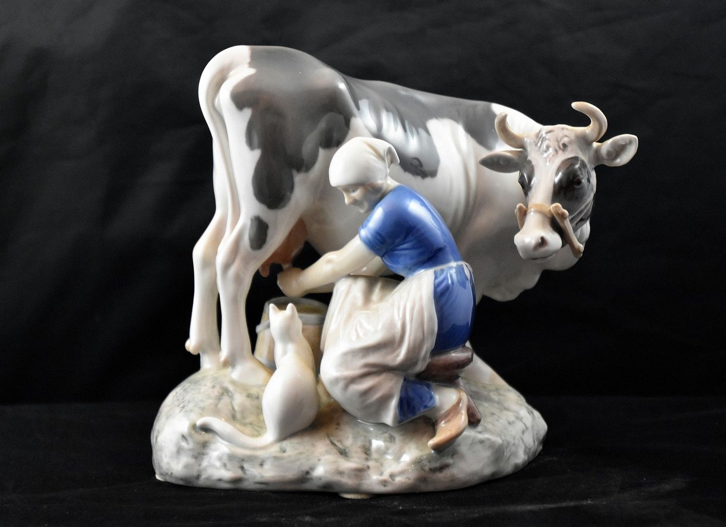Bing & Grøndahl, Malkepige i blå kjole, der malker sortbroget ko. Lille hvid kat se på. no. 2017,