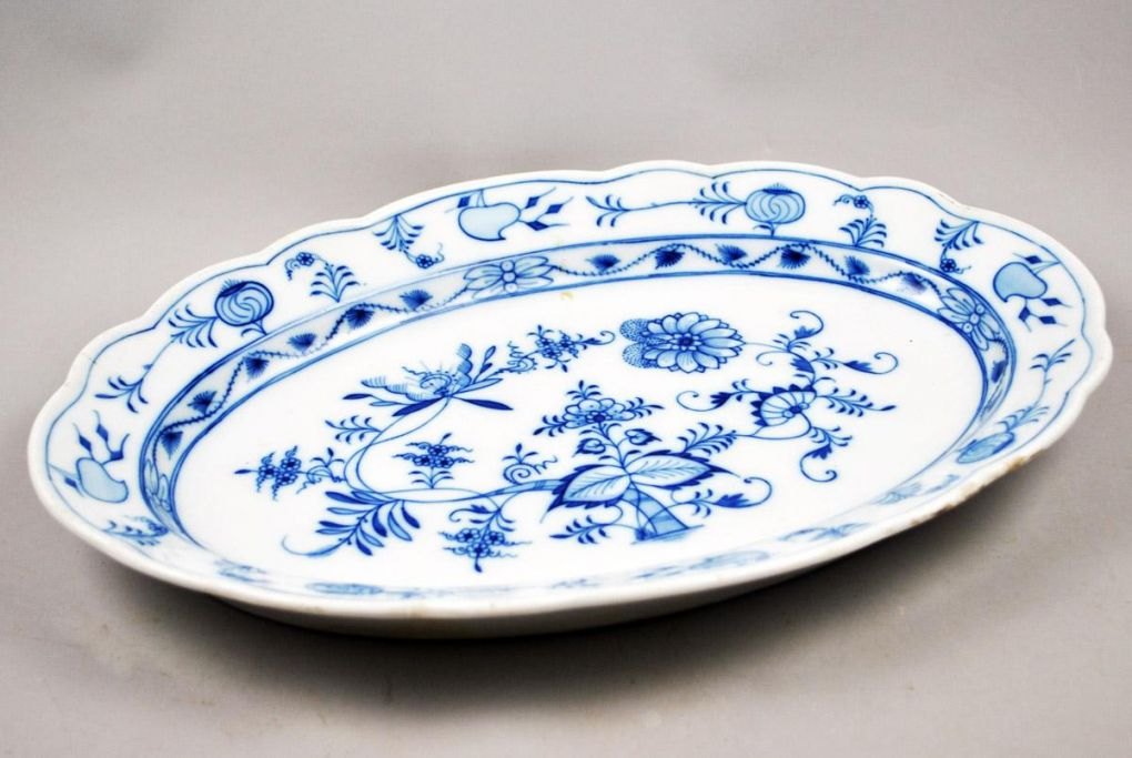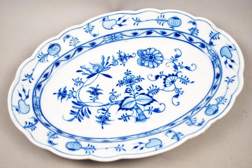 Stort Meissen porcelæns stegefad, løg mønstret, 1909 - 1929, Meissner Ofen- und Porzellanfabrik AG, C. Teichert. 44 x 29 cm. Stemplet.: Meissen