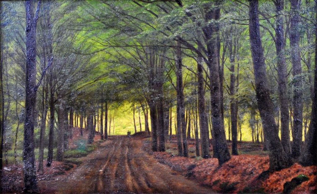 Groth, Vilhelm (1842 - 1899) Danmark. Personer på en vej i en skov - forår. Olie på lærred. Sign.: Vilh Groth 84. 35 x 68 cm.