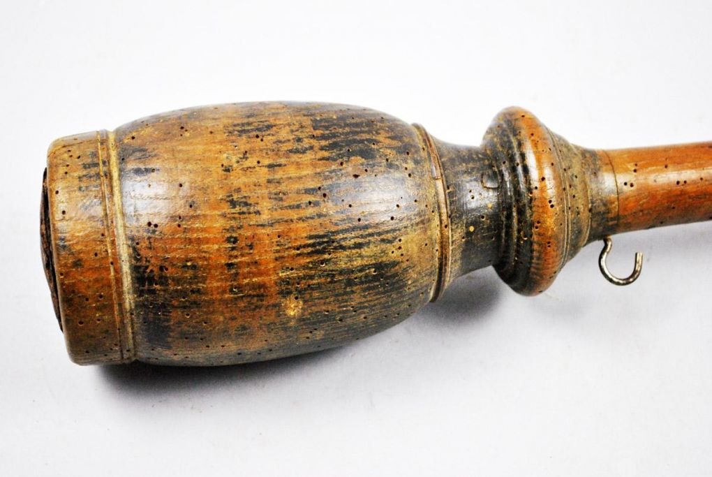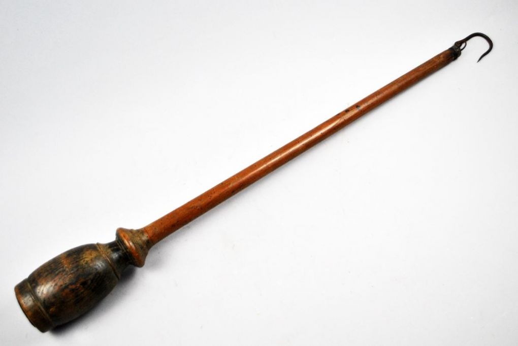 Dansk 1700-tals bismervægt i egetræ. Træstang udstyret med en jernkrog i den ene ende og en drejet klods i den anden med jernring. På stangen messingsøm som måleenheder. L.: 87 cm.