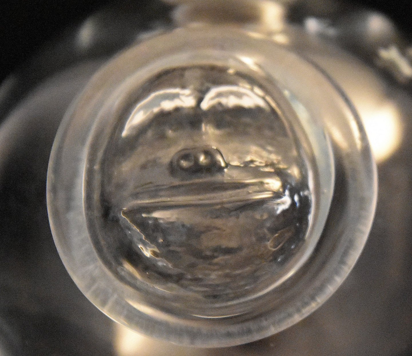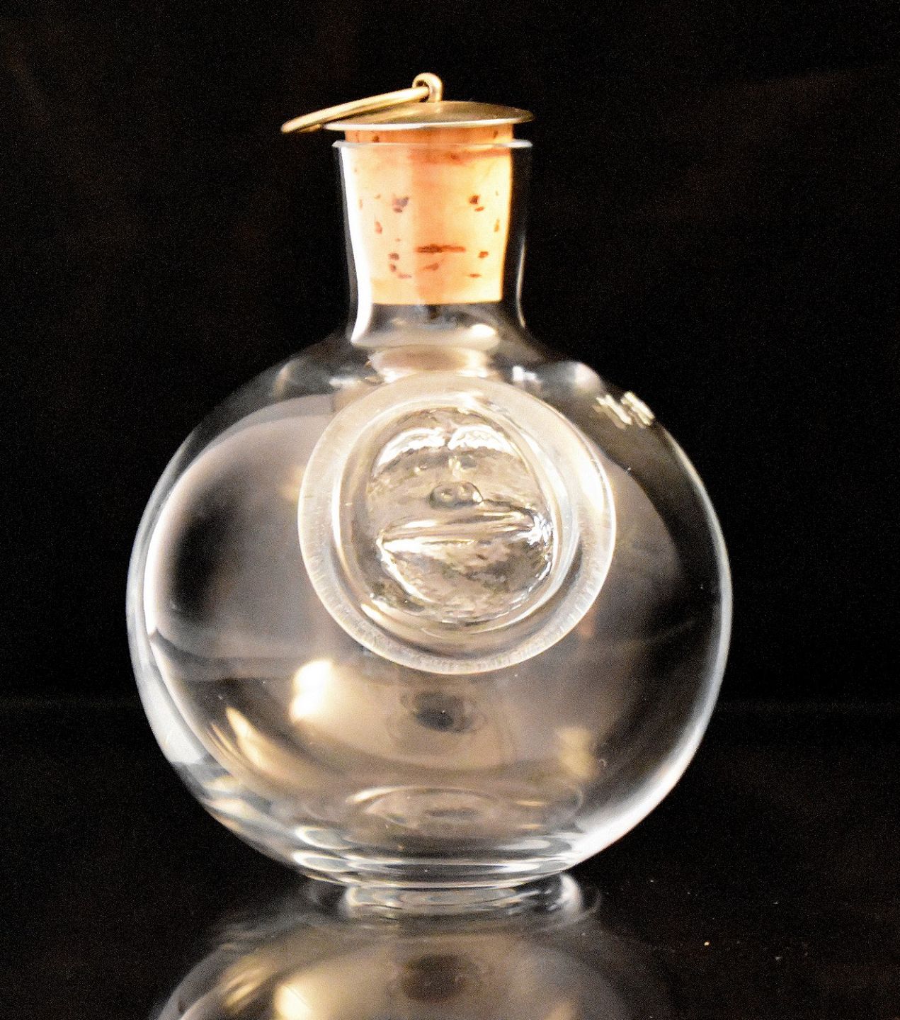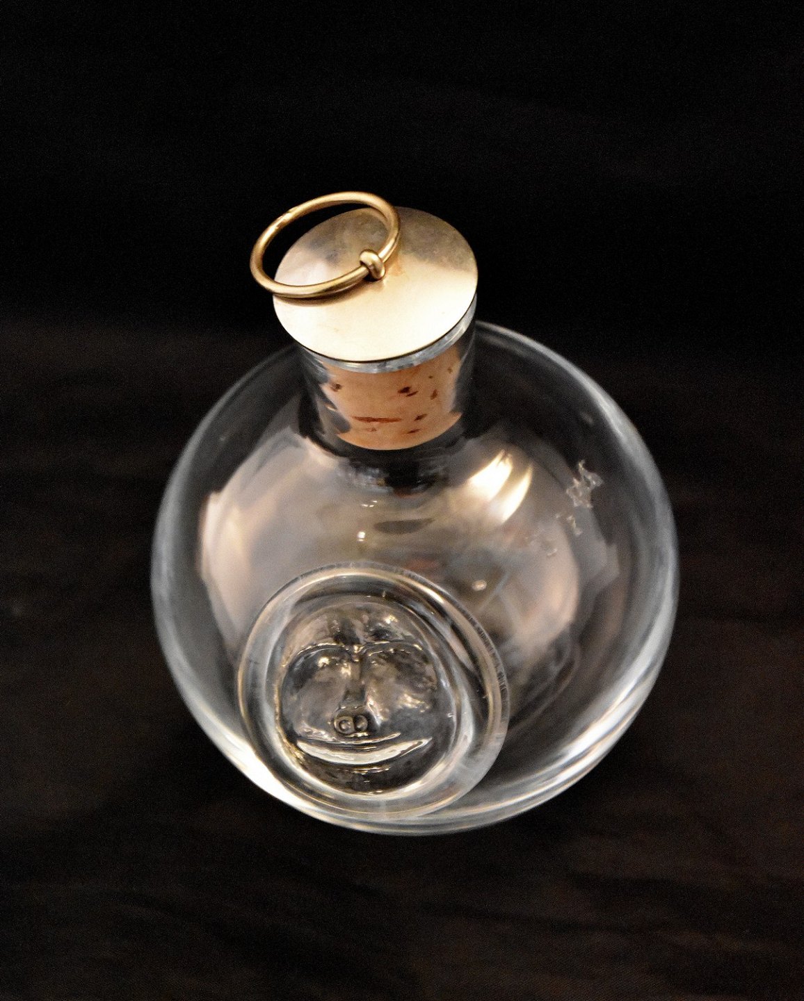 Lille kugleformet flaske, kaldet "halv abe", med påsat abe hoved. Produceret Holmegaard Glasværk 1977