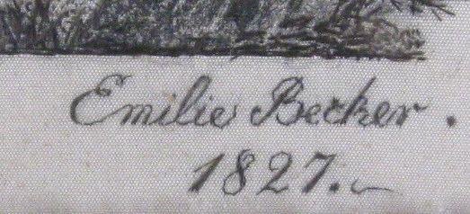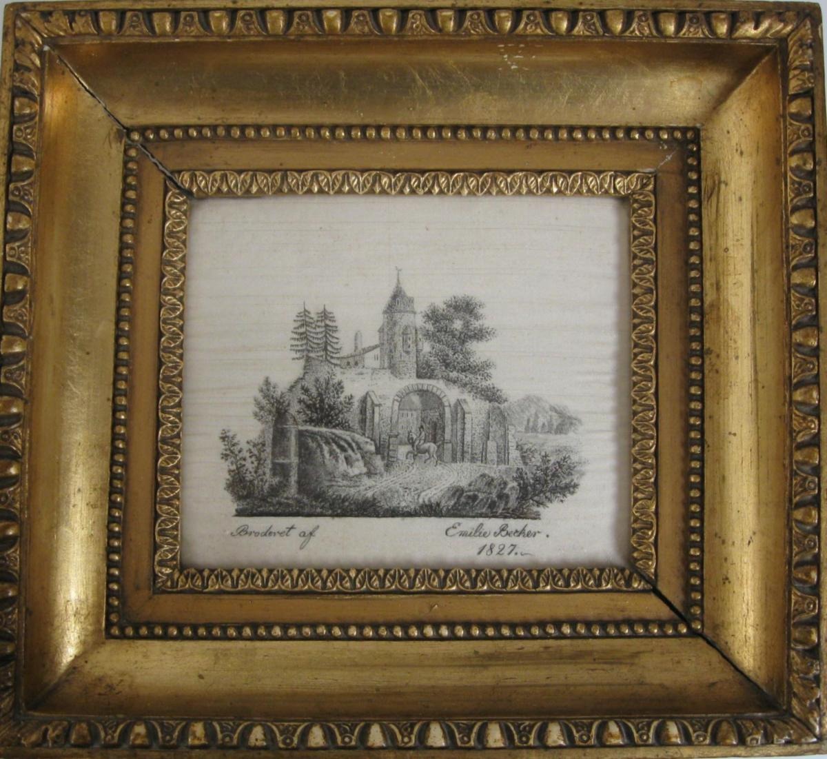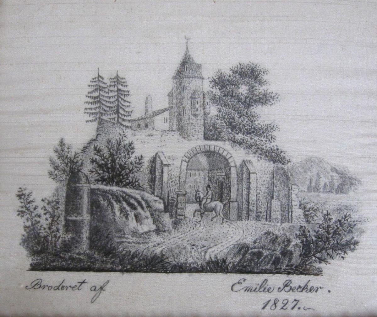 Broderi, udført af Emilie Becker 1827. Forestillende en mand på hest på vej ind i en borg. Broderet på silke. 13 x 15 cm. I forgyldt empire ramme. På bagsiden anført.: Nutte til erindring af tante Bebba.