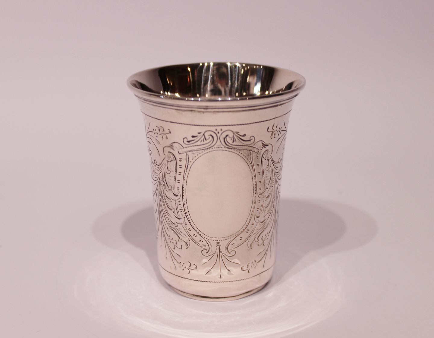 Lille bæger dekoreret med ciseleringer i tretårnet sølv fra 1930erne.