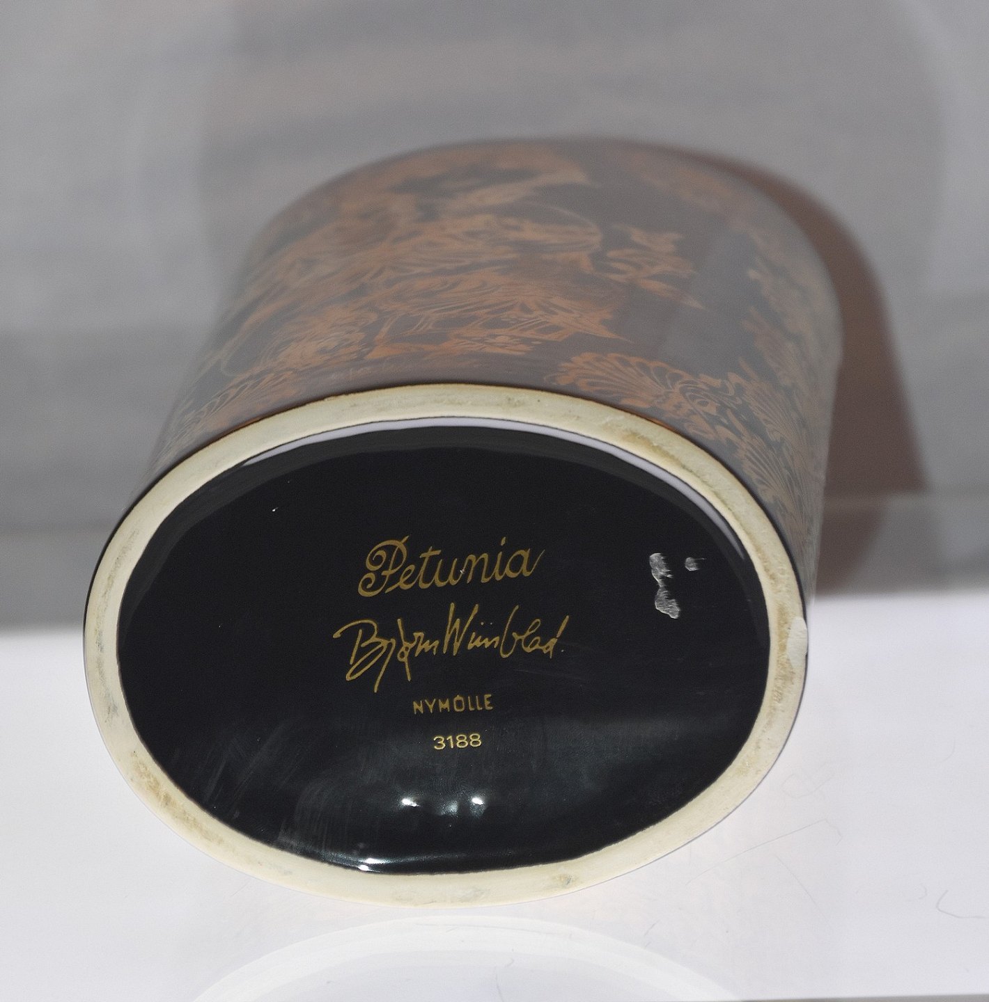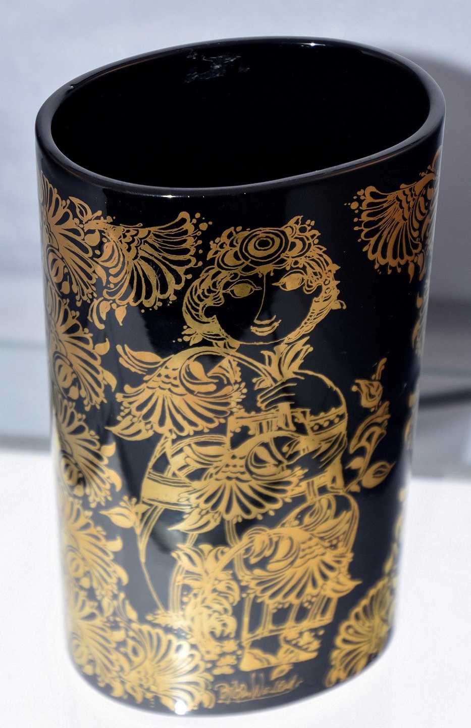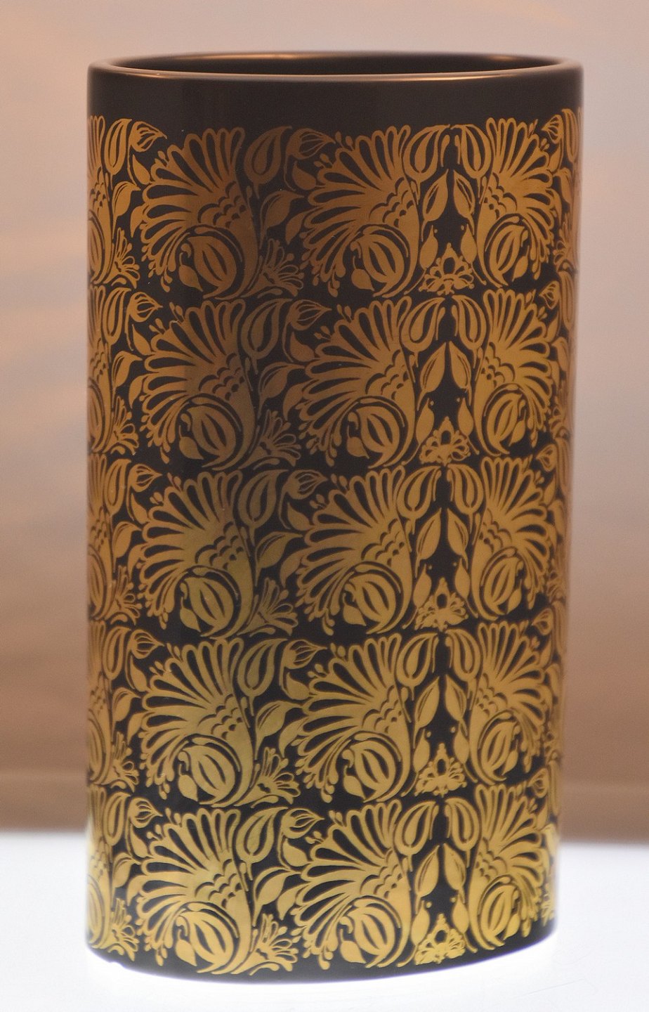 Oval vase med gylden tryk.