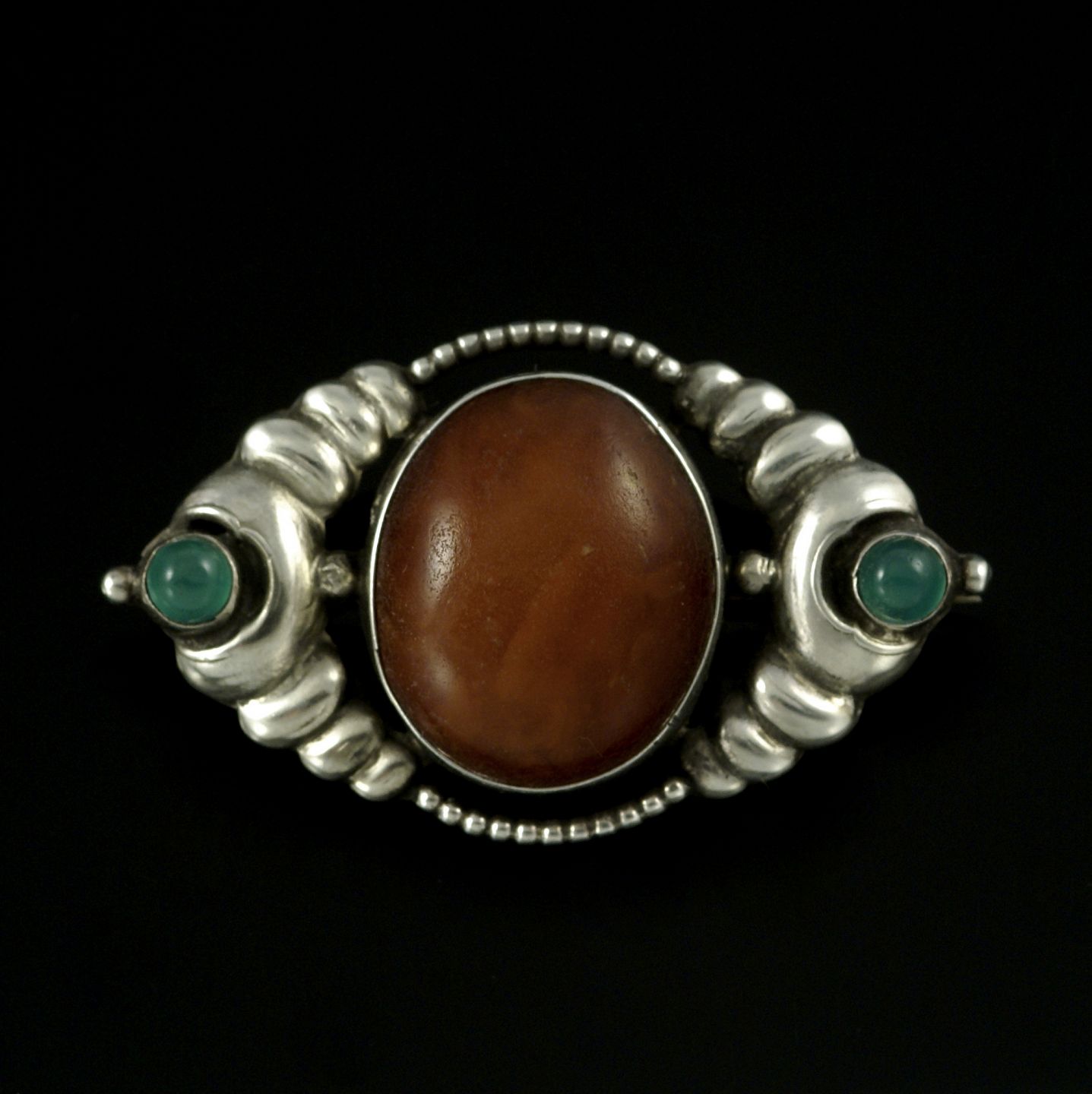 William Fuglede 1907 - 1937. Art Nouveau Silver Brooch with Amber and Green Agate.