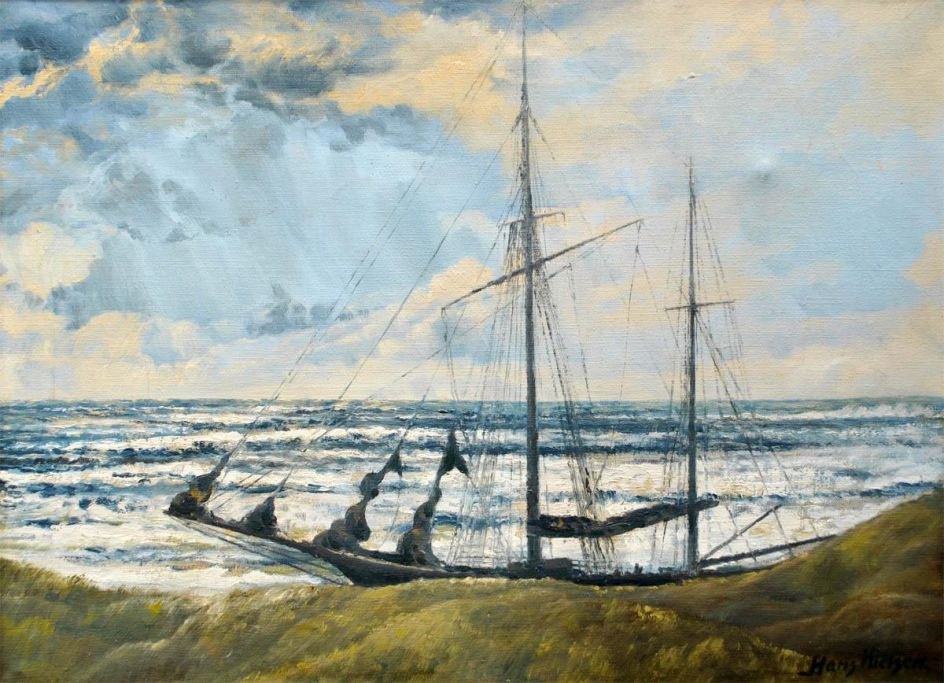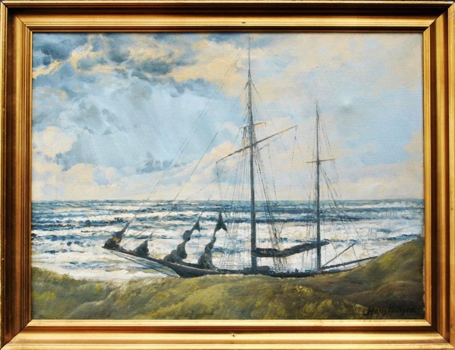 Nielsen, Hans (20th century) Denmark .: Stranding. Oil on canvas. Signed: Hans Nielsen. 41 x 55 cm.